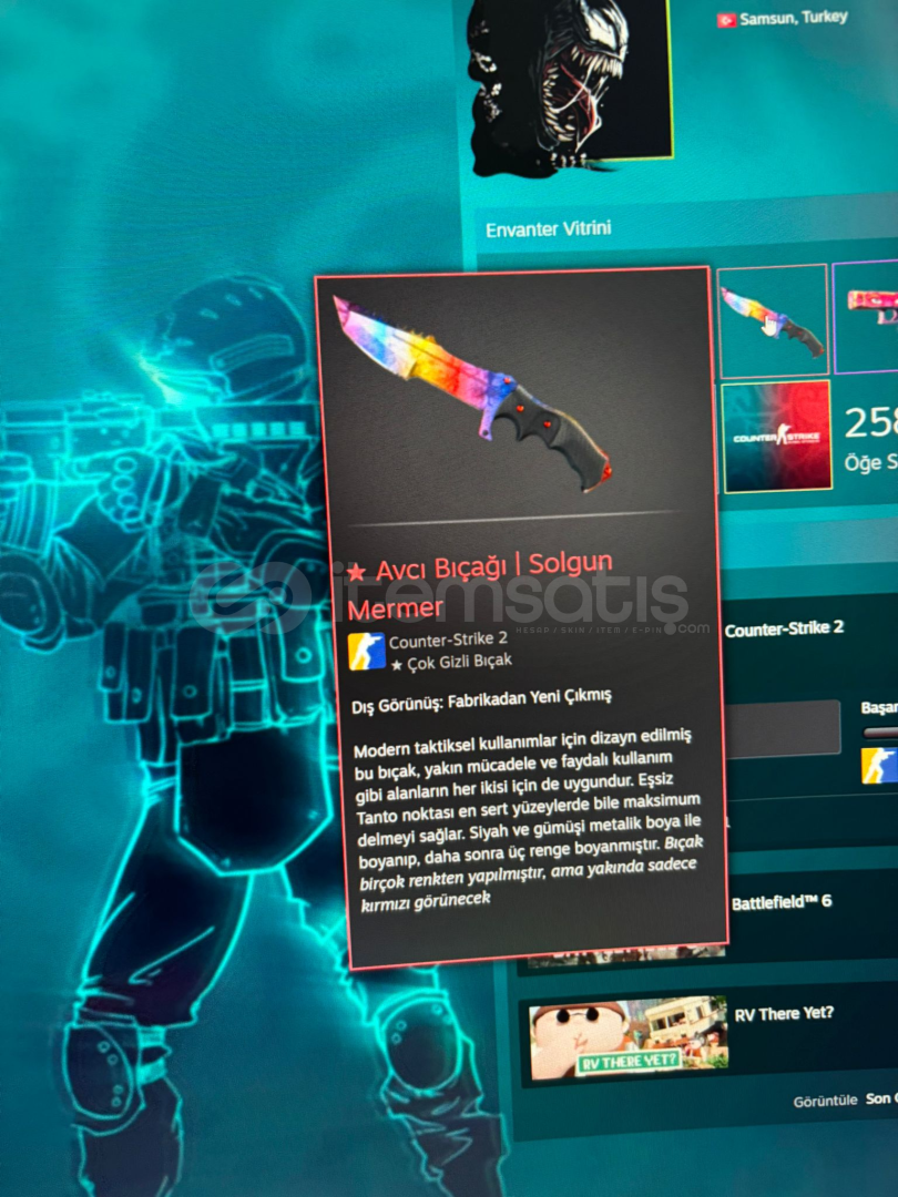 Türkiye Menşeili hesaptır. İlk sahibiyim yurt dışına çıkacağım için satıyorum. Herhangi bir t@kas banı veya vac durumu yoktur. Gönül rahatlığıyla kullanabilirsiniz. İlan fiyatının yüksek olması içindeki oyunlar ve cs'deki 1600 sat ve bıçaklar, eldiven vesaire olduğu içindir. Güven faktörü YEŞİL
