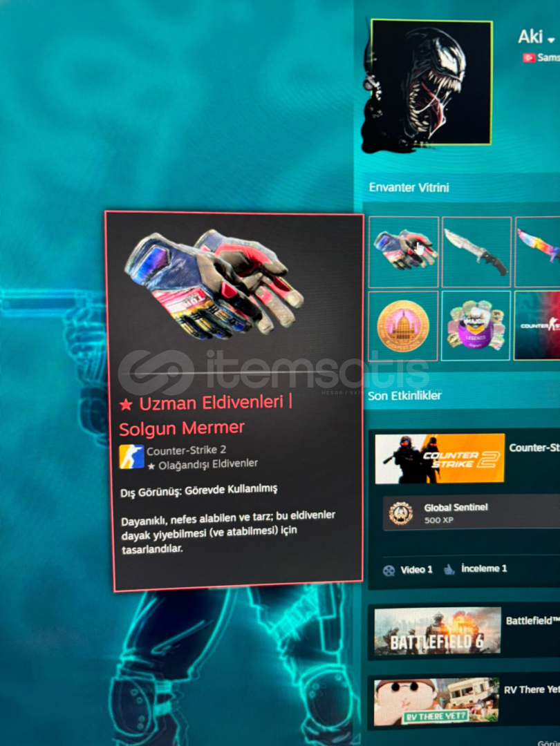 Budapeşte 2025 JetonuGlobal Offensive Rozeti★ StatTrak™ Avcı Bıçağı | Alazlanmış Aşınma Durumu: 0,542726338 ★ Avcı Bıçağı | Solgun Mermer Aşınma Durumu: 0,010799554★ Uzman Eldivenleri | Solgun MermerAşınma Durumu: 0,352191985Canals BroşuClutch'a Hoş Geldiniz BroşuTrain BroşuZafer BroşuYaban Ateşi BroşuUSP-S | KabukGlock-18 | VogueAWP | ÖlümÇift Dikiş McCoy | USAF TACP