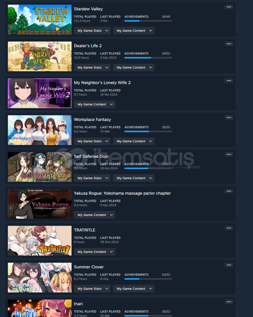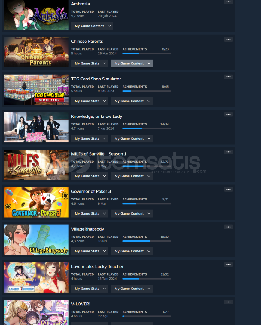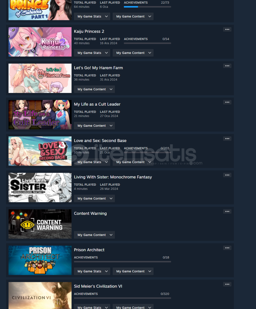 *Hesapta 失业了,我获得了亿万游戏财产!, V-LOVER!, MILFs of Sunville, 乡村狂想曲, Inari, FreshWomen, Let's Go! My Harem Farm, Self Defense Dojo, Kaiju Princess 2, Love & Sax: Second Base, TCG Card Shop Simulator, Island, Sax & Survival, Imperial Harem, Workplace Fantasy-New Girl Chapter, Workplace Fantasy, 美女,请别影响我学习, Love n Life: Lucky Teacher, Summer Clover, Sid Meier's Civilization VI, Prison Architect, Dealer's Life 2, Massage Parlor, Stardew Valley, 傲慢的怪獸公主與名偵探使魔, Living With Sister: Monochrome Fantasy, Handyman Legend, My Neighbor's Lonely Wife 2, Chinese Parents, Country Bumpkin Yutaka, President Yukino, Ambrosia, TRATRITLE, My Life as a Cult Leader Oyunları Bulunmaktadır