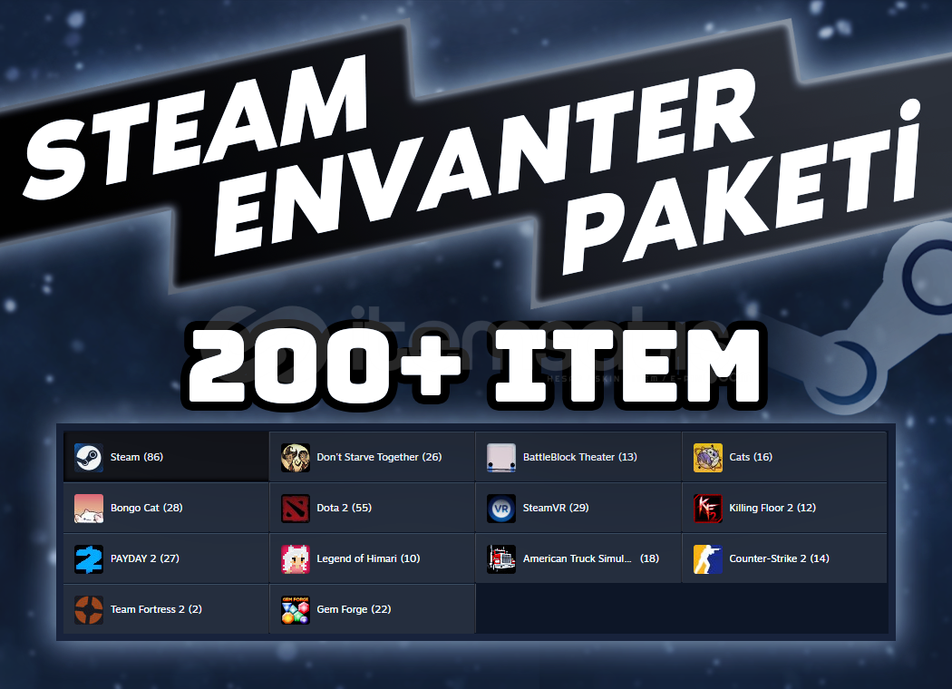 ✅ Steam envanterinize 14 FARKLI OYUNDAN ve HEPSİ BİRBİRİNDEN FARKLI toplamda 200'den fazla item eklenecektir.