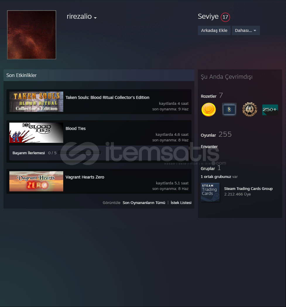 ✅HESAPTA 255 OYUN ✅250+ KOLEKSİYONER ROZETİ ✅STEAM HESABI 2017✅140 GÜN ÇEVRİMDIŞI✅ 17 SEVİYE STEAM✅ 8 YIL HİZMET✅ ✅ E-posta Erişimi https://steamcommunity.com/profiles/76561198407471146