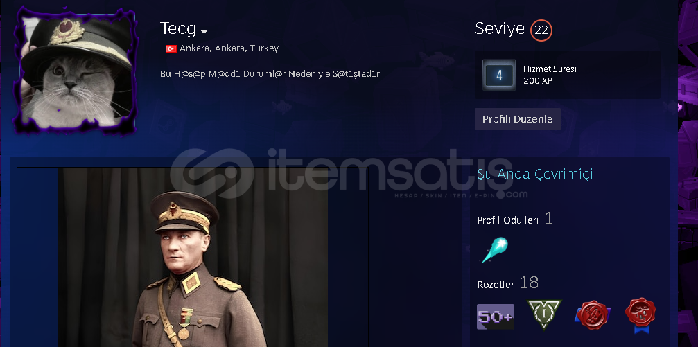 Hesabımı dara düştüğüm için satıyorum, ne var ne yok her şeyi satacağım. 65 Satın alınmış, 754 adet oyun bulunmakta. GTA-V, ETS2, Half-Life (Orange Box), Hoi4, Left 4 Dead (ve serisi), BF1 ve BF5, Fallout 4 gibi oyunlar içeriyor. Özellikle TF2 de 1.000+ saatim ve iyi bir envanterim var. Hesap Hakkında Daha Fazlası İçin: https://steamcommunity.com/id/Tecg/