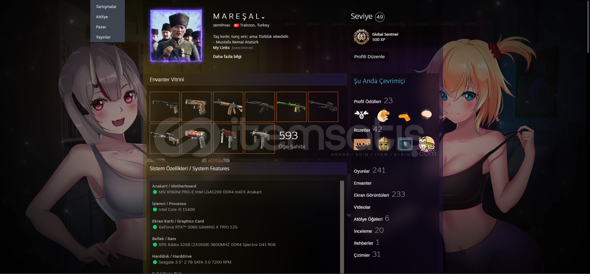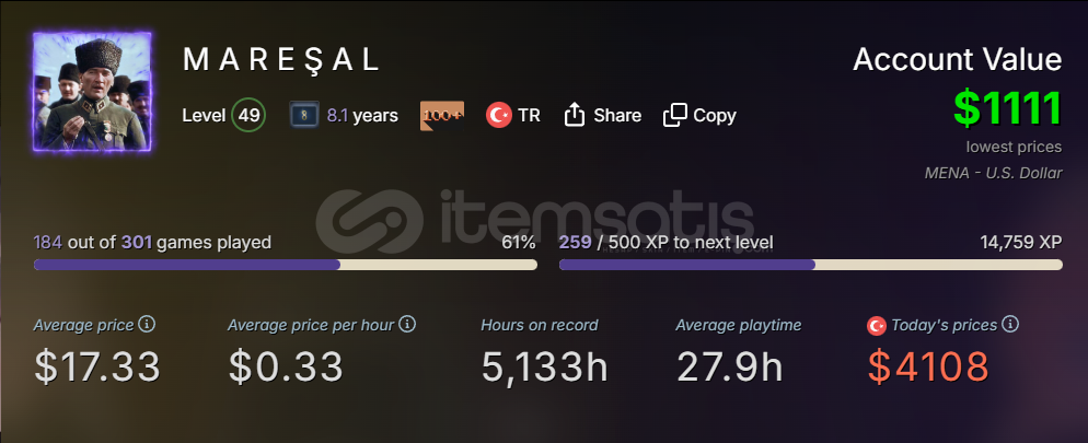 Hesabımda Hiçbir Ban Bulunmamaktadır.Çoğu Oyunda Baya İlerlemelerim varDediğim gibi 8 Yıllık Aktif kullandığım Hesabımdır. Envanterde Yaklaşık 20 Dolarlık Counter Strike 2 Skinleri Var Hesabı İncelemek İçin Mesaj Atabilirsiniz Alanı Üzmez. 241 Oyun 247 DLC var Tüm Oyunların Toplam 5,133 Saati var