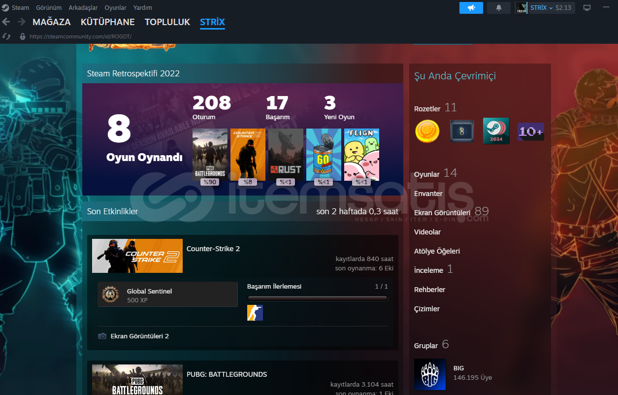 8 YILLIK STEAM HESABI CS2 SEÇKİN VE MADALYALIDIR.SADECE PUBG DEN YASAKLIDIRAMA BİLDİRİ VEYA UYARI YOKTUR.CİDDİ ALICILAR YAZSIN .İLK E POSTA İLE VERİLECEKTİR.RUST .CS2 .7 Days to Die .GİBİ OYUNLAR VARDIR.