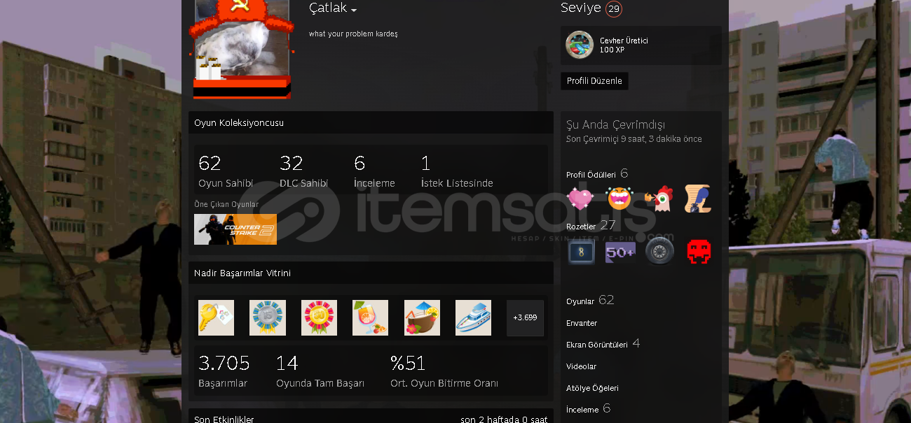 Artık eskisi kadar aktif kullanmadığım için ve acil ihtiyaç durumum olduğu için hesabımı satıyorum.HERHANGİ BİR ŞEKİLDE VAC BAN BULUNMAMAKTADIR, GÜVENLİ HESAPTIR.Hesabın durumu ekte bulunan fotoğraflarda ki haldedir, extra olarak sorunuz olursa sorabilirsiniz olabildiğince hızlı şekilde geri dönüş yapmaya çalışacağım.PAZARLIK KABUL EDE...