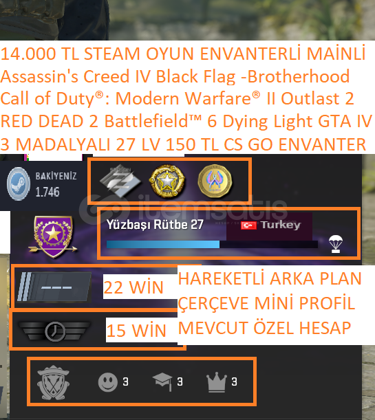 Battlefield 6 RED DEAD 2 Modern Warfare® II 14.000 TL STEAM OYUN ENVANTERLİ 3 MADALYALI 27 LV 150 TL CS GO ENVANTERLİMADALAYA:2025 HİZMET MADALYASI 2 SEZON JETON BADGE JETONWİN:REKABETCİ :22 WİN YOLDAŞ:15 WİNPRİME RANK :REKABETCİ:BELİRSİZGÜVEN FAKTÖRÜ:YEŞİLCS GO SEVİYE:27 LV 2026 HİZMET MADALYASI ALICAKSTEAM LV:7 LV HAREKETLİ ARKA PLAN VE ÇERÇEVE MİNİ PROFİL MEVCUT...