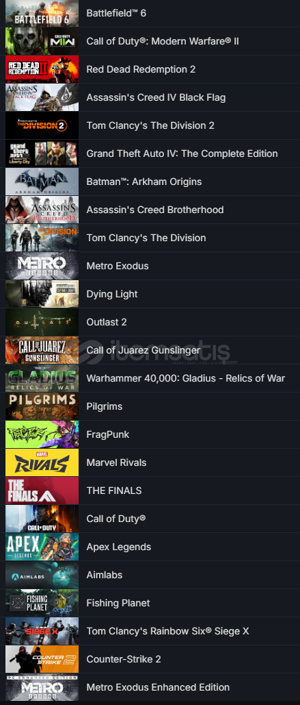 OYUNLAR :CS GO 2 PRİME Battlefield™ 6 Red Dead Redemption 2  Call of Duty®: Modern Warfare® II Assassin's Creed IV Black Flag Tom Clancy's The Division 2 Grand Theft Auto IV: The Complete Edition Batman™: Arkham Origins Assassin's Creed Brotherhood Tom Clancy's The Division Metro Exodus Dying Light Outlast 2 Call of Juarez Gunslinger Warhammer 40,000: Gladius - Relics of War Pilgrims FragPunk Marvel Rivals THE FINALS Call of Duty®  Apex Legends Aimlabs