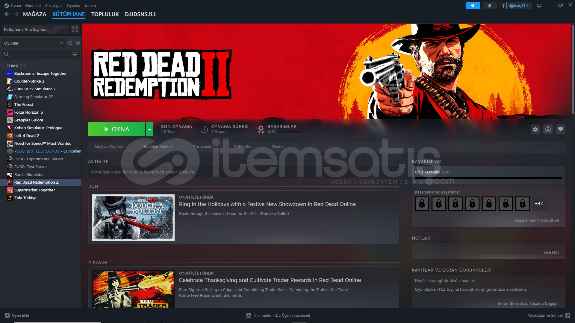 HESABIN İÇİNDEKİLER-RDR 2-FARMİNG SİMULATOR 22-NEED FOR SPEED MOST WANTEDHİÇBİRİNİ OYNAYAMADIM RDR2 Yİ SADECE BİR KAÇ SAAT DENEME ŞANSIM OLDU BENLİK BİR OYUN OLMADIĞINI ANLADIMGÖZÜKEN DİĞER OYUNLAR BENİM DİĞER HESAPLARIMDA BULUNAN OYUNLAR.