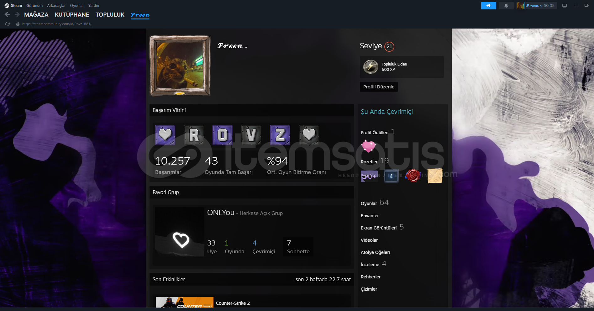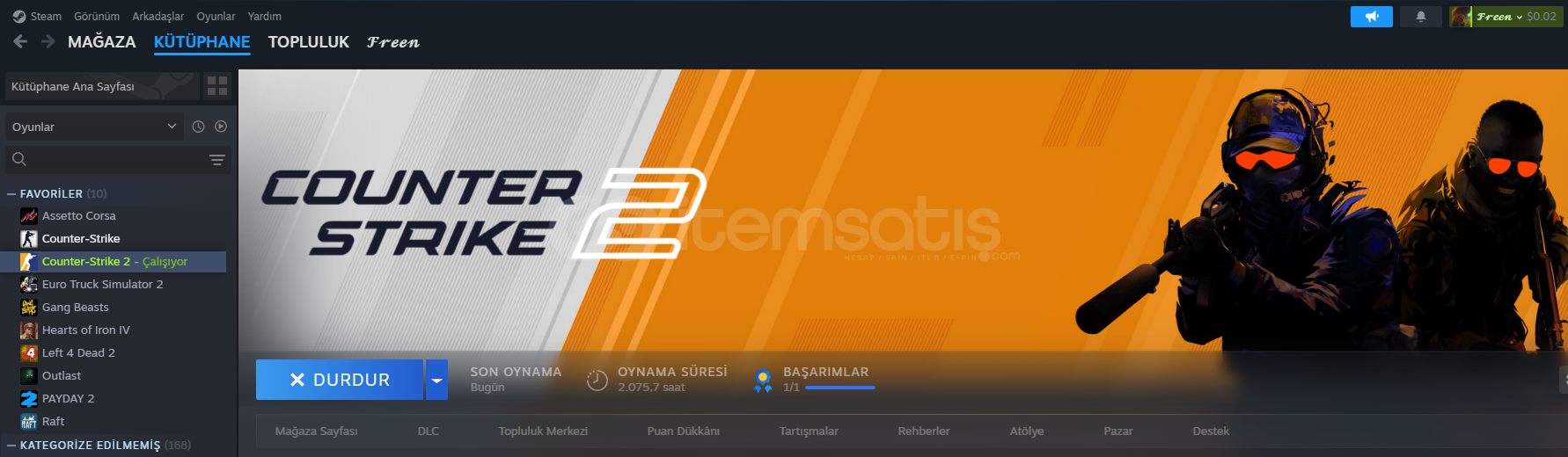 Hesapta 6683 tane Puan vardır Puan Dükkanında Harcana Bilir.Hesapta 64 oyun vardır.Counter Strike 2 25 Kasımda 5 yıllık madalyası gelecekLeft 4 Dead 2Counter Strike 1.6Euro Truck Simulator 2Hearts of Iron IVThiefOutlastPayday2Assetto Corsa Ultimate Edition Full DlcRaftGang BeastsHesaptaki bazı oyunlar bunlardır.4 Tane Profil Arka Planı 1i Hareketli.4 Tane Avatar Çerçevesi 2si Hareketli.3 Tane Hareketli Avatar.8 Tane Sohbet ...