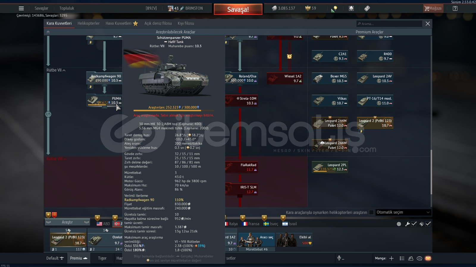 Mailinize Devredilcektir. Oyun oynamayı bıraktığım için satıyorum. CS2 seçkin hesaptır. CS:GO döneminden madalyası vardır.War Thunder Oyununda Premium Leopard 2 PzBtl 123 Aracı vardır. Almanya 8. Seviyeye kadar kasılmıştır. Şuanda Puma kasılıyor 48bin araştırma puanı kaldı.🎮 HESAPTA BULUNAN TÜM OYUNLAR