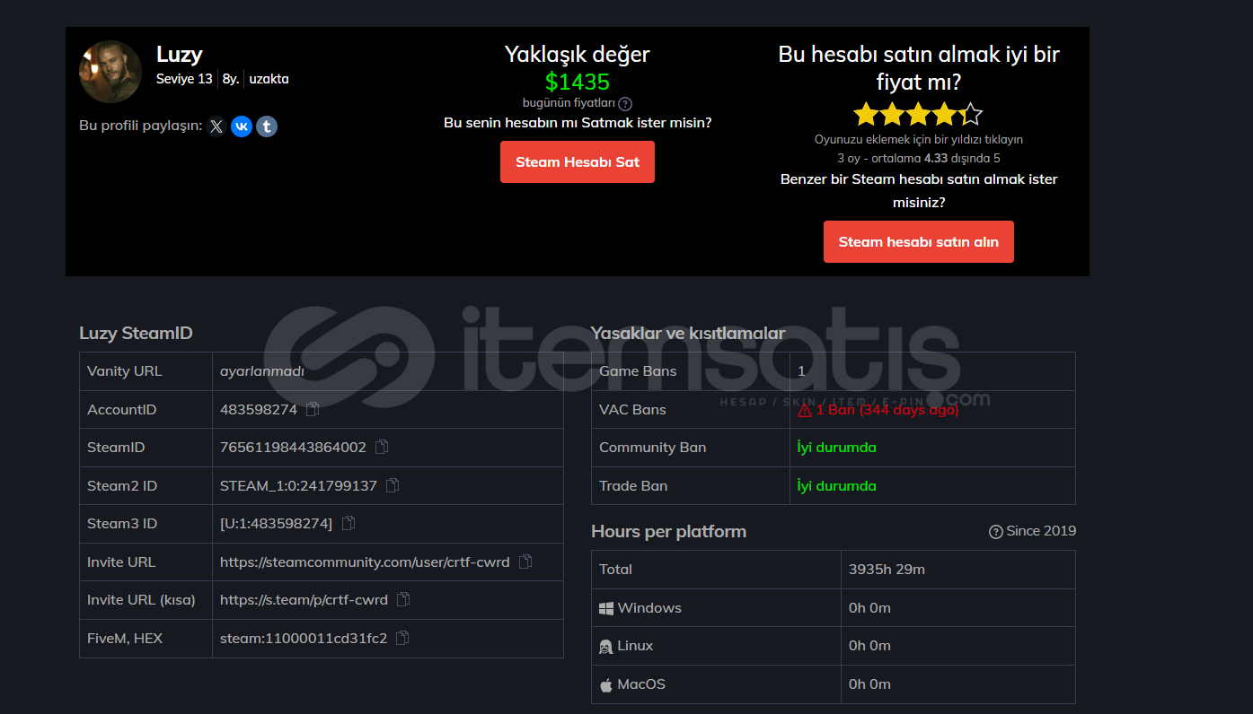 13 Level 12 Rozet 12bin kullanılabilir puan mevcut 2 farklı oyunda ban mevcut CSGO ve Scum Easy antichat banı mevcut Evlilik aşamasında olduğum için acil satılıktır... :)
