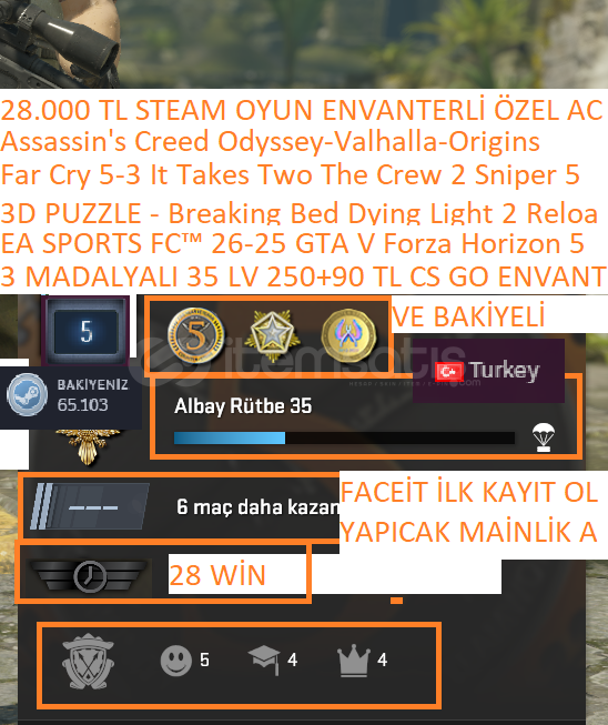 EA SPORTS FC 26-25 GTA V 3D PUZZLE Breaking Bed 28.000 TL STEAM OYUN ENVANTERLİ 3 MADALYALI 35 LV 250+90 CS GO ENVANTERLİMADALAYA:2024 HİZMET MADALYASI 5 YIL JETON BADGE JETONWİN:REKABETCİ : WİN YOLDAŞ: WİNPRİME RANK :REKABETCİ:BELİRSİZGÜVEN FAKTÖRÜ:YEŞİLCS GO SEVİYE: LV STEAM LV:6 LVSTEAM PUAN:65.103 İSTEDİĞİNİZ HAREKETLİ ALABİLİRSİNİZSTEAM BAKİYE...