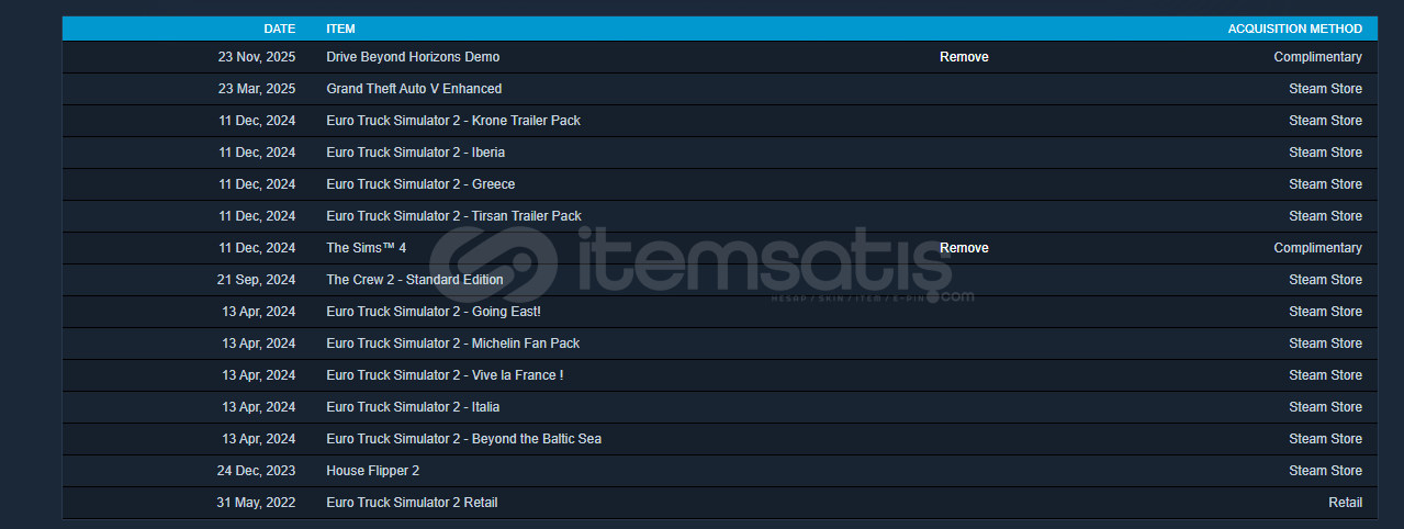 🏠 OYUNLAR:House Flipper 2 (Popüler Ev Yenileme Simülasyonu)Euro Truck Simulator 2 (Ana Oyun)🚛 EURO TRUCK SIMULATOR 2 - DLC PAKETLERİ: Hesapta oyunun en önemli ve pahalı harita paketleri mevcuttur:Harita Genişletmeleri:Greece (Yunanistan Haritası - Yeni)Iberia (İspanya & Portekiz)Italia (İtalya)Vive la France ! (Fransa)Beyond the Baltic Sea (Baltık Ülkeleri)Going East! (Doğu Avrupa)Tır ve Parça Paketleri:Krone...