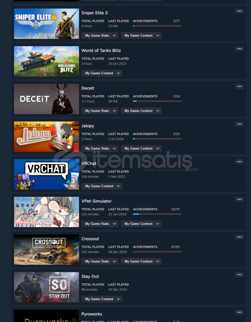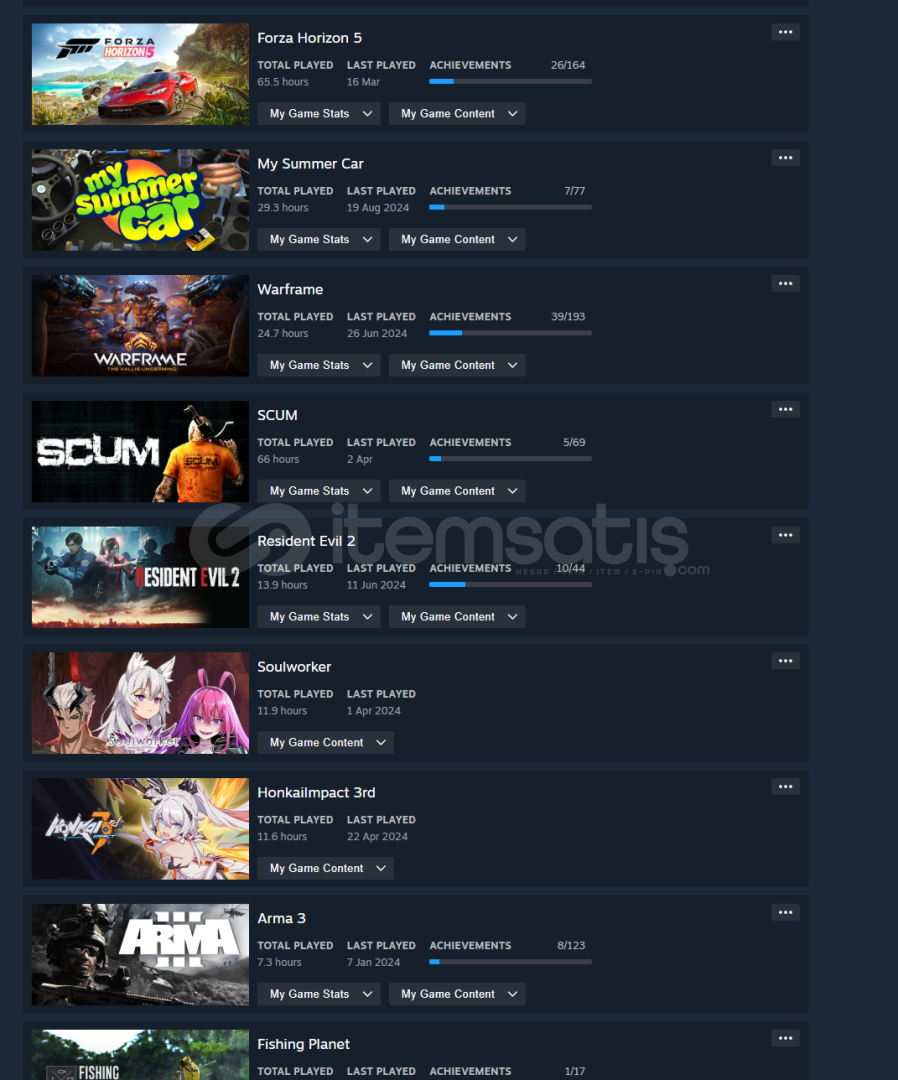 Ana OyunlarForza Horizon 5 - Standard EditionResident Evil 2 - Deluxe EditionArma 3Sniper Elite 3BeamNG.driveSCUMMy Summer CarJalopyEk Paketler (DLC)Arma 3: Jets & Marksmen DLCSniper Elite 3: Season PassFishing Planet: Lucky Start Pack✅ Hesap Güvenliği:Kişisel Hesap: Çalıntı değildir, tamamen kişisel hesaptır.Tam Erişim: Satın alım sonrası e-posta ve şifre dahil tüm bilgileri kendi üzerinize al...