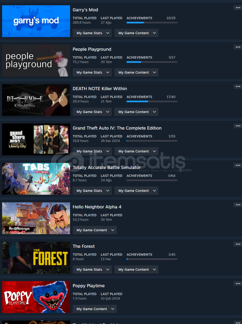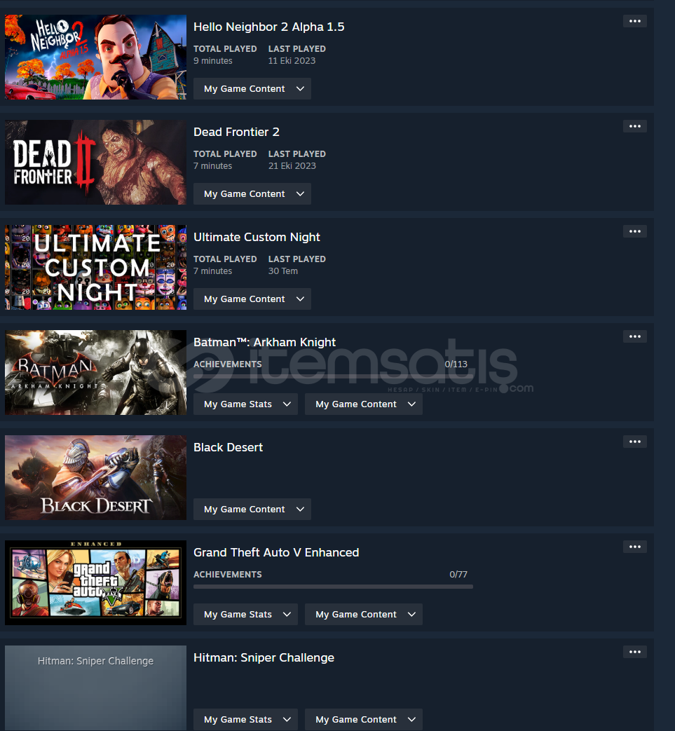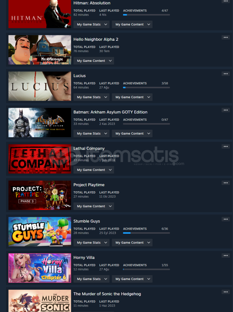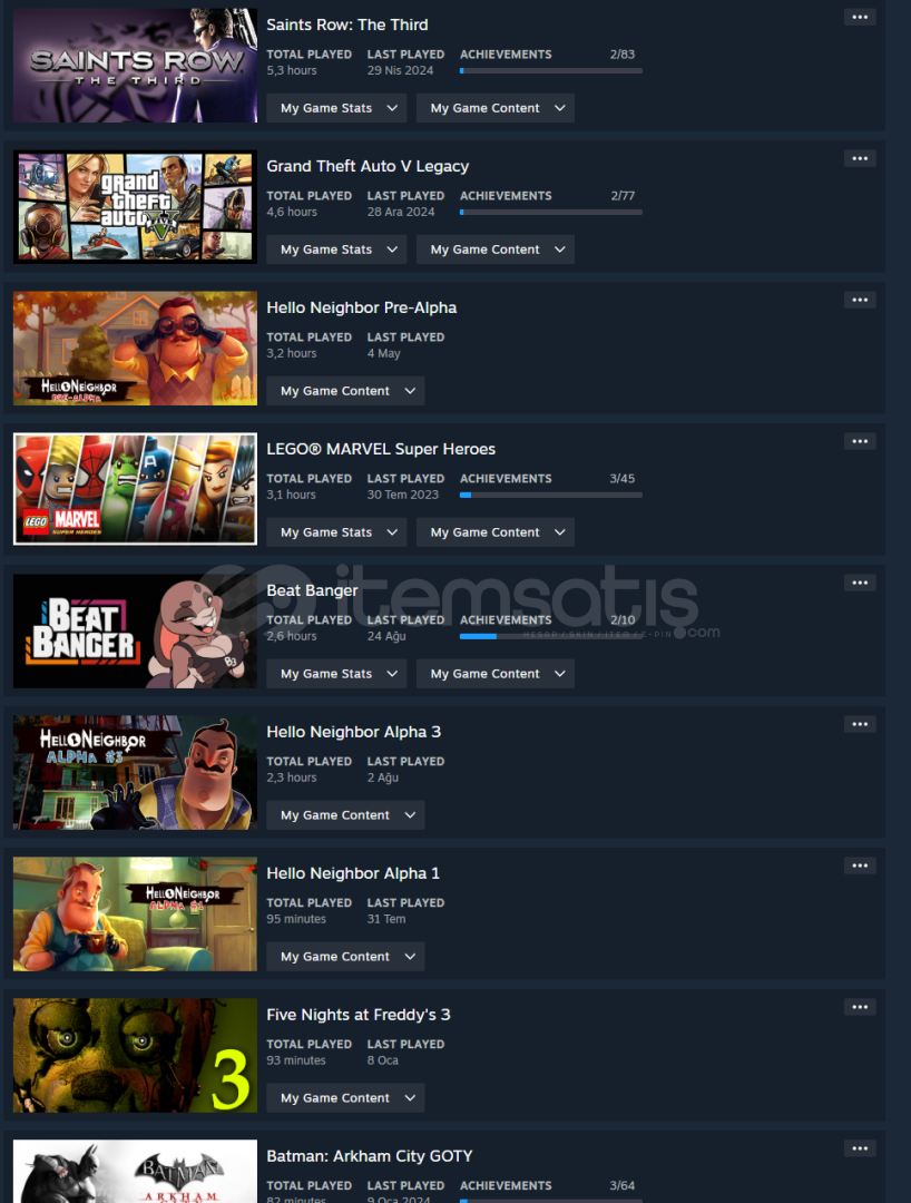 *Hesapta Garry's Mod, Beat Banger, LEGO Marvel Super Heroes DLC: Super Pack, Hitman Absolution, The Forest, Black Desert, DEATH NOTE Killer Within, Party Animals, Lethal Company, Five Nights at Freddy's 3, Totally Accurate Battle Simulator, Batman: Arkham Collection, People Playground, Saints Row: The Third, Five Nights at Freddy's, Lucius, LEGO Marvel Super Heroes,  Oyunları Bulunmaktadır