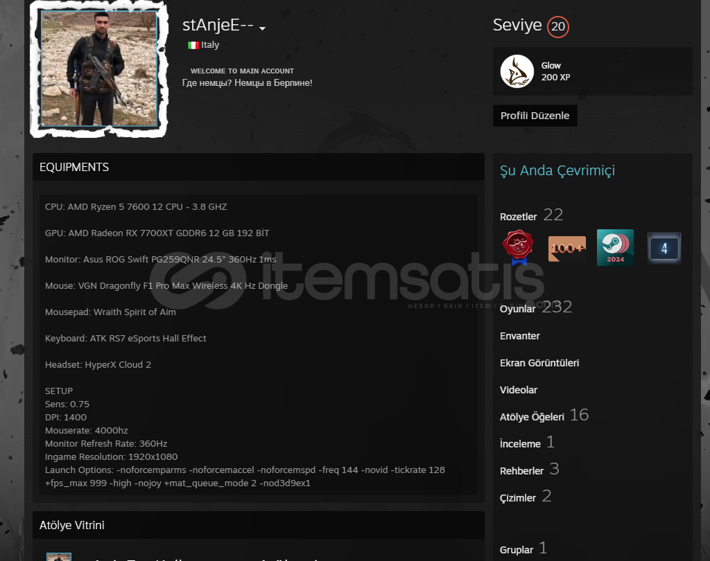 Bilgisayarımı sattığım için boşa düştü herşeyi benim üstüme aktif olarak kullanmaktaydım hesabım 20 seviyedir. İçinde RDR Rust CS2 Seçkin gibi oyunlar mevcut