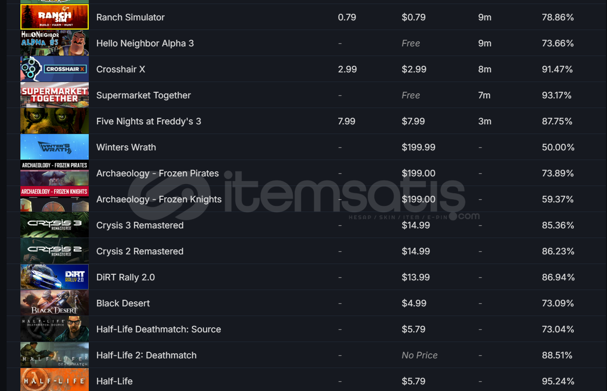 (Alana Xbox Gamepass Ultimate Hediye!)🎮 50 Oyunlu Steam Hesap – VAC Ban Yok, 3x 200$ Değerinde Oyun Dahil!Açıklama:Satılık Steam hesabımda toplam 50 oyun bulunmaktadır. Tüm oyunlar fotoğraflarda gösterilmiştir. Hesapta ayrıca 3 adet 200$ değerinde oyun mevcuttur.Yazılımlar:Wallpaper EngineLossless ScalingCrosshairX ve benzeri yardımcı yazılımlarHesap VAC ban içermez ve oyunlar...
