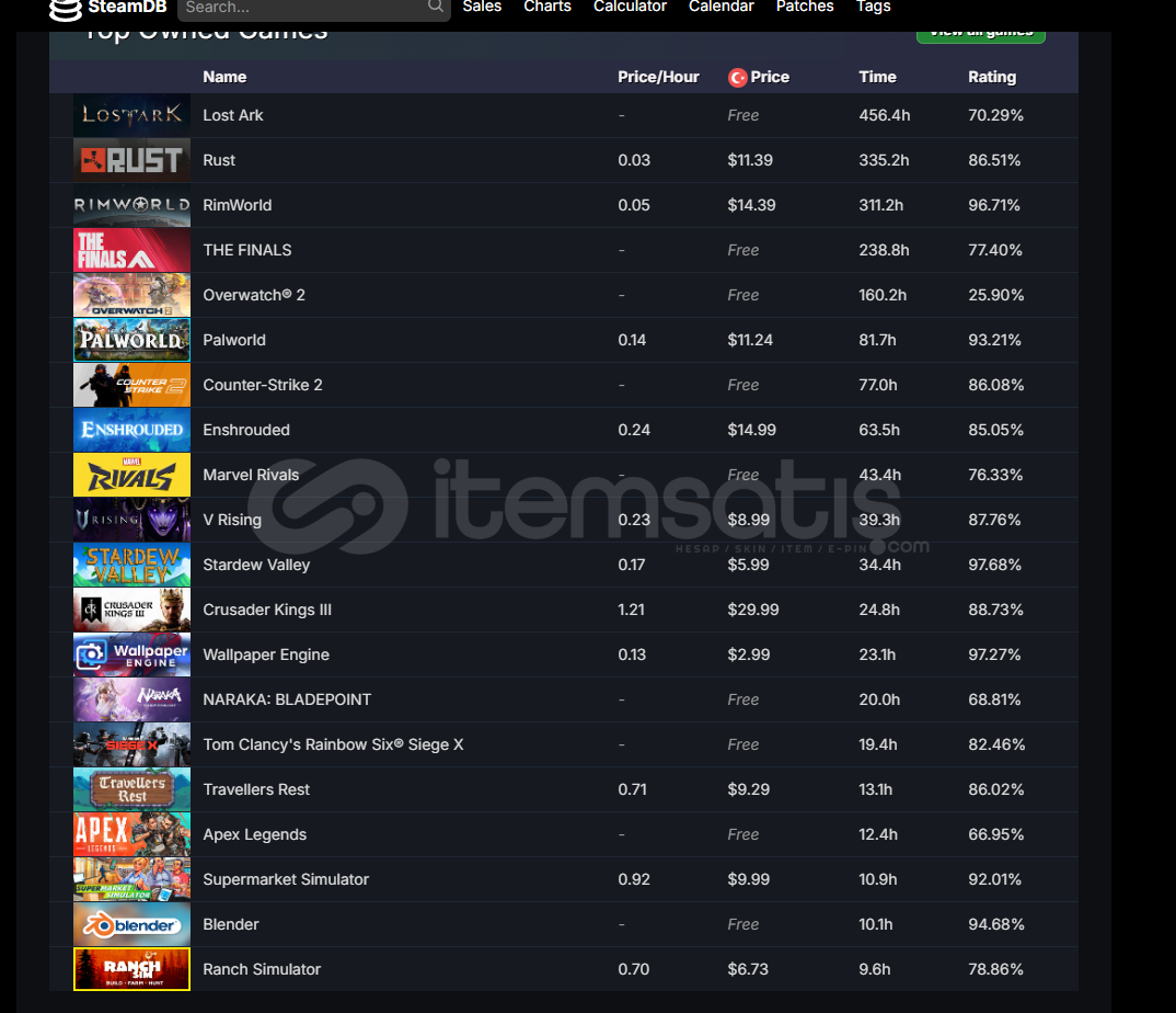 CS2 Premium + Pass, Rust (DLC’li), RimWorld (tüm DLC’ler), The Finals (Platinum rank, 20$ bakiye), Lost Ark (1600 ilvl, paralı içerikler) ve 40’tan fazla oyun mevcut.