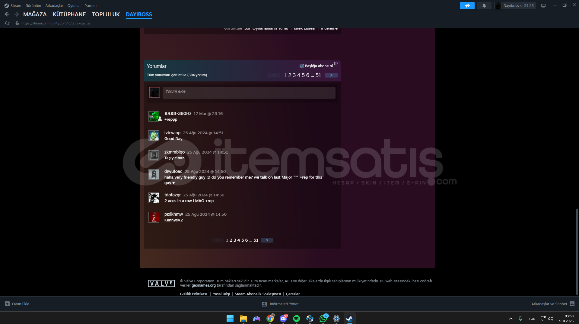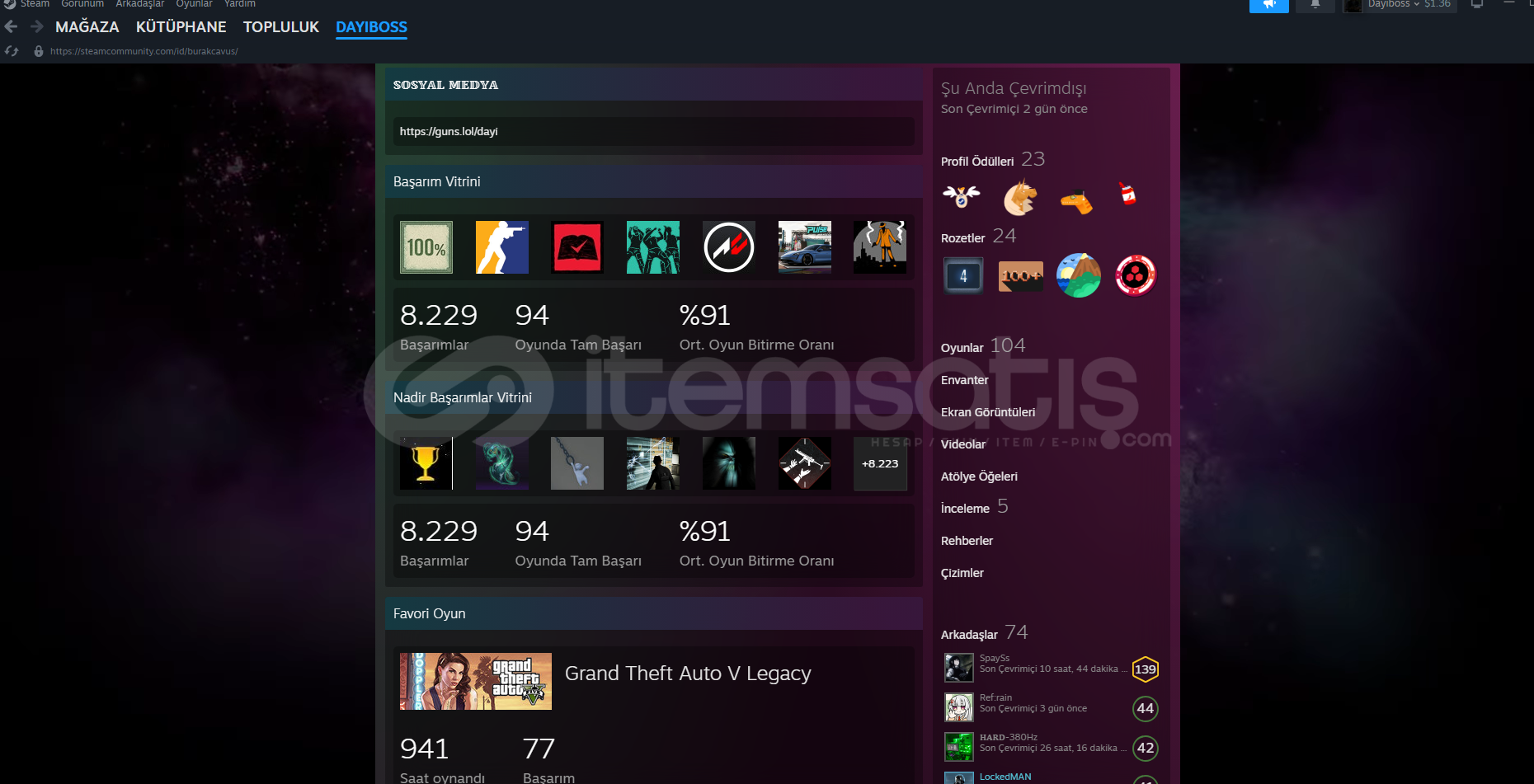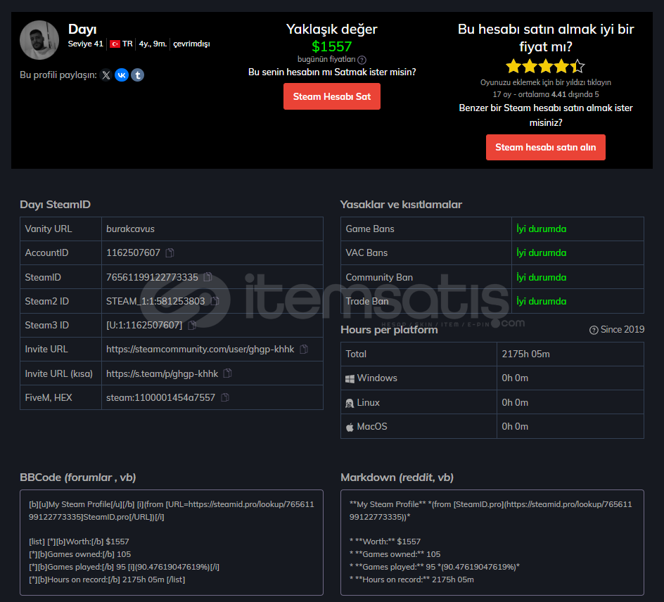 İlk elden hesabımı bilgisayarı satacağım için satıyorumHesapta herhangi bir şekilde köttü amaçlı yazılım kullanılmamıştırRevaçtaki bir çok oyun bulunmaktadır Hesabın değeri 1560 dolardırHesabın içinde 1.36 dolar var ama pazarda 2 kasa var 3 dolar civarı hesap bakiyesi olacakHesap herkese açık konumdadır isterseniz linki atarım...