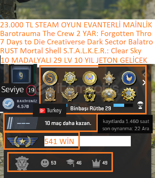 RUST Dead by Daylight Mortal Shell Creativerse 23000 TL STEAM OYUN ENVANTERLİ STEAM LV 19 10 MADALYALI 29 LVMADALAYA:2017 2018 2021 2022 2023 2024 HİZMET MADALYASI TAVUK JETON 5 YIL JETON BADGE JETON SADAKAT ROZETİWİN:REKABETCİ : WİN YOLDAŞ:541 WİNPRİME RANK :REKABETCİ:BELİRSİZGÜVEN FAKTÖRÜ:YEŞİLCS GO SEVİYE:29 LV STEAM LV:19 LV ÇİZİM EKLENEBİLİRSTEAM PUAN:4.578STEAM YIL:9.9 ...