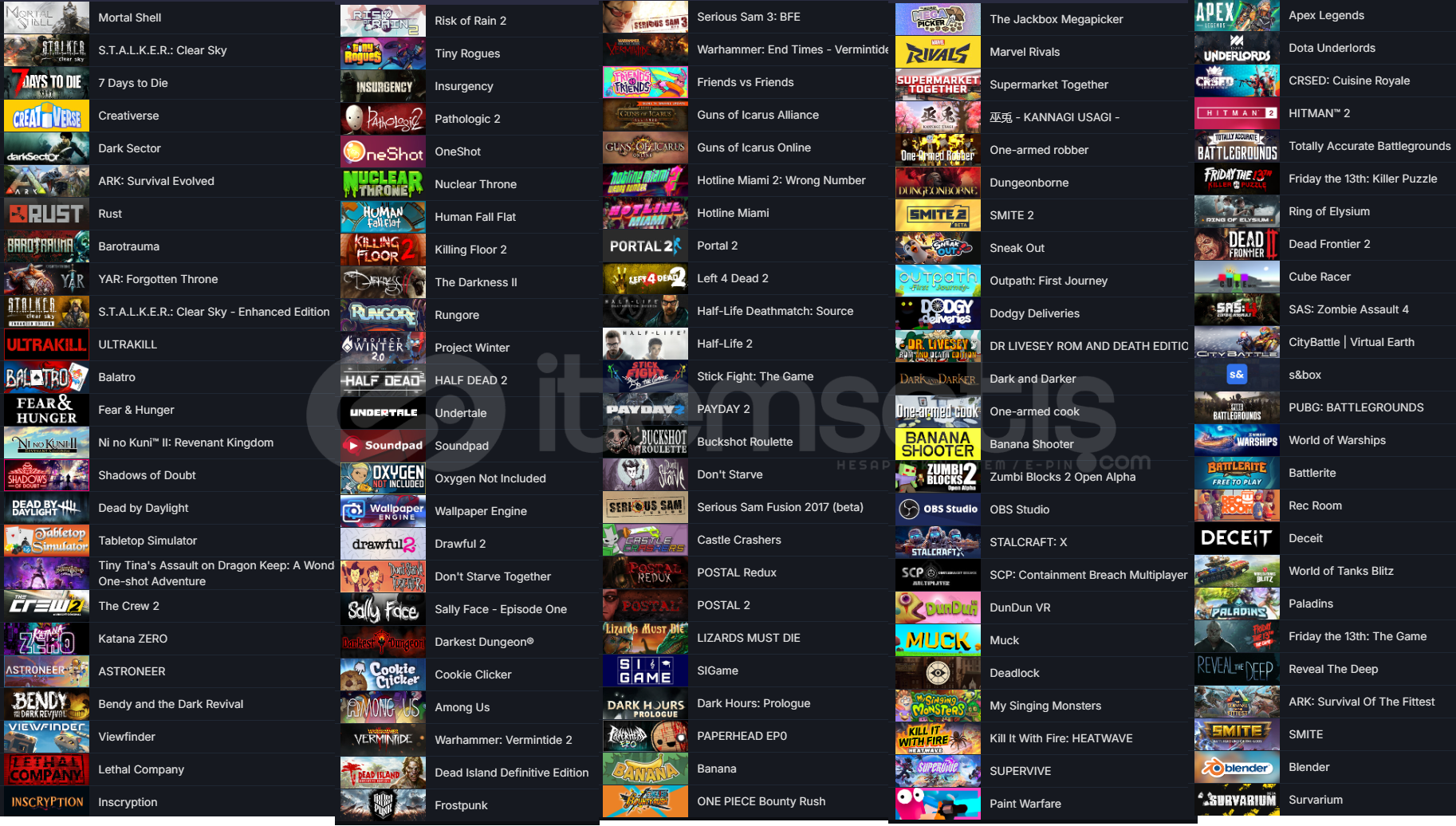 OYUNLAR :CS GO 2 PRİME RUST Mortal Shell S.T.A.L.K.E.R.: Clear Sky 7 Days to Die Creativerse Dark Sector ARK: Survival Evolved Barotrauma YAR: Forgotten Throne S.T.A.L.K.E.R.: Clear Sky - Enhanced Edition ULTRAKILL Balatro Fear & Hunger Ni no Kuni™ II: Revenant Kingdom Shadows of Doubt Dead by Daylight Tabletop Simulator Tiny Tina's Assault on Dragon Keep: A Wonderlands One-shot Adventure The Crew 2 Katana ZERO ASTRONEER Bendy and the Dark Revival Viewfinder Lethal Company Inscryption Risk of Rain 2 Tiny Rogues Insurgency Pathologic 2 OneShot Nuclear Throne Human Fall Flat Killing Floor 2 The Darkness II Rungore Project Winter