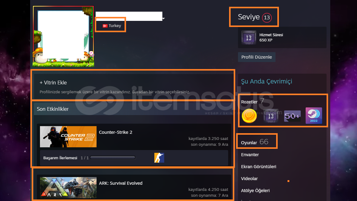 RUST PUBG PLUS GTA V Call of Duty: WWII-Black Ops III-II 17.100 TL STEAM OYUN ENVANTERLİ STEAM LV 13 8 MADALYALIMADALAYA:2019 ÇİFT 2025 HİZMET MADALYASI TAVUK JETON 10 YIL JETON 5 YIL JETON BADGE JETON SADAKAT ROZETİWİN:REKABETCİ : WİN YOLDAŞ: WİNPRİME RANK :REKABETCİ:BELİRSİZGÜVEN FAKTÖRÜ:YEŞİLCS GO SEVİYE:1 LV STEAM LV:13 LV HAREKETLİ ARKA PLAN ÇERÇEVE MEVCUTSTEAM PUAN:...