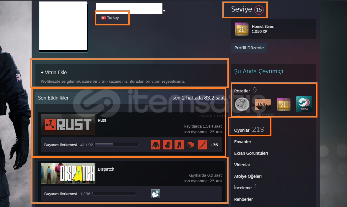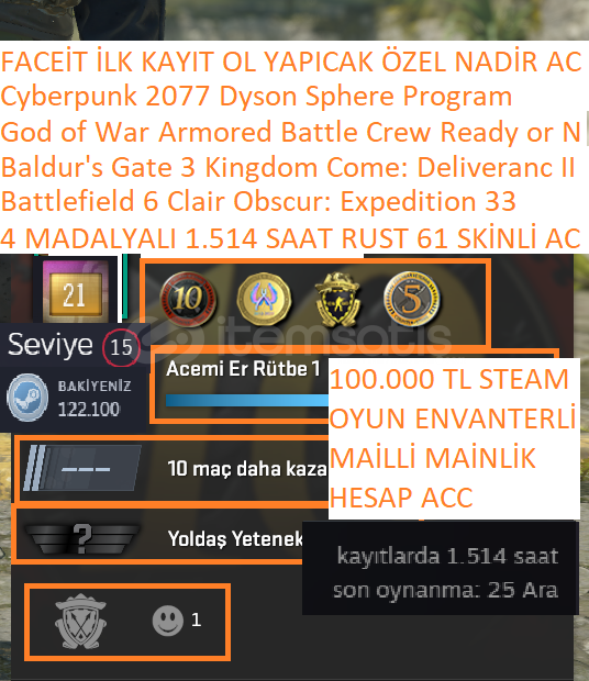 RUST SAATLİ 61 SKİNLİ Battlefield 6 GTA V-IV Cyberpunk 2077 100.000 TL STEAM OYUN ENVANTERLİ STEAM LV 15 4 MADALYALI 1514MADALAYA:10 YIL JETON 5 YIL JETON BADGE JETON SADAKAT ROZETİWİN:REKABETCİ : WİN YOLDAŞ: WİNPRİME RANK :REKABETCİ:BELİRSİZGÜVEN FAKTÖRÜ:YEŞİLCS GO SEVİYE: LV STEAM LV:15 LV ÇİZİM EKLENEBİLİRSTEAM PUAN:122.100 İSTEDİĞİNİZ AL...