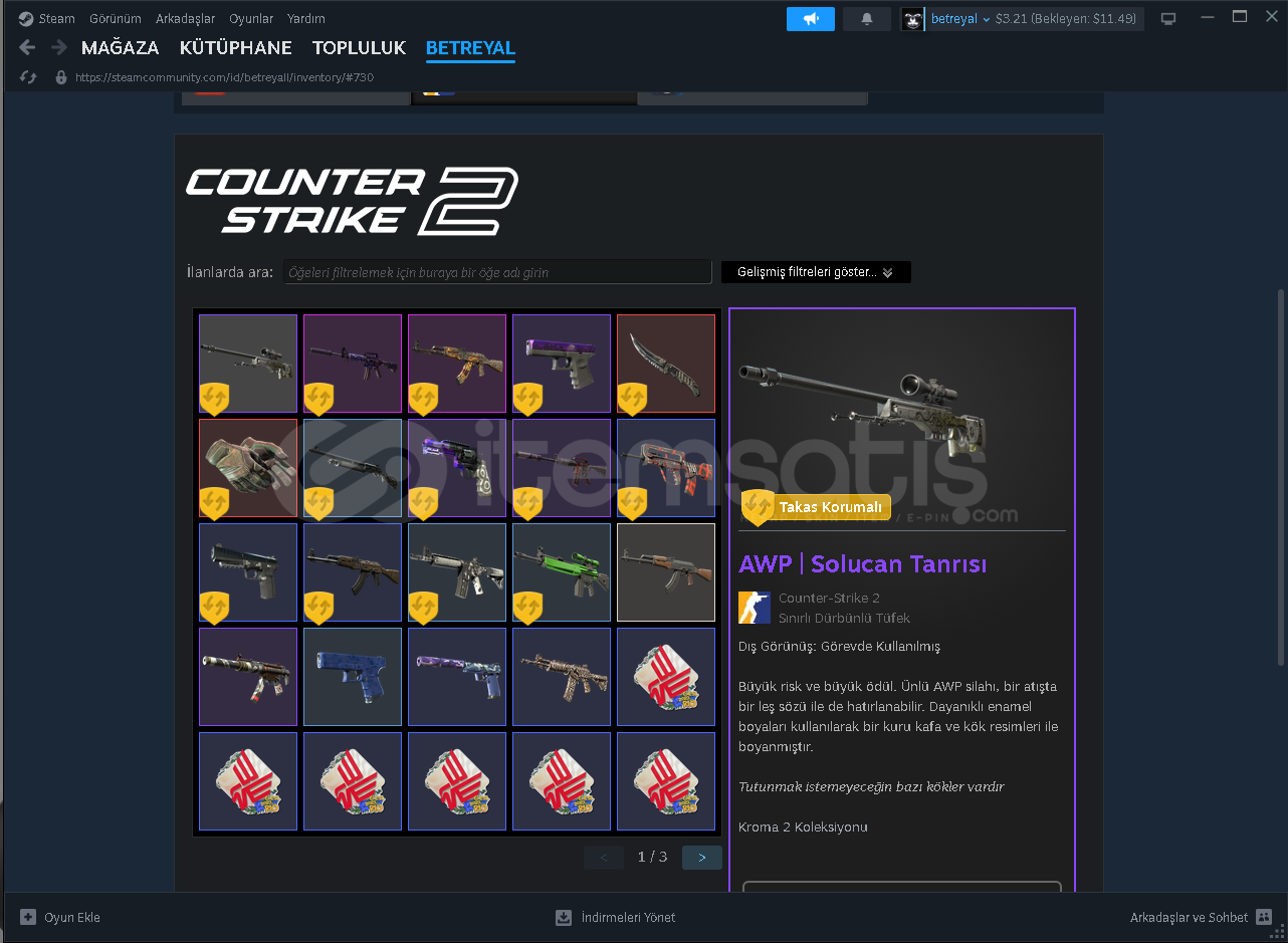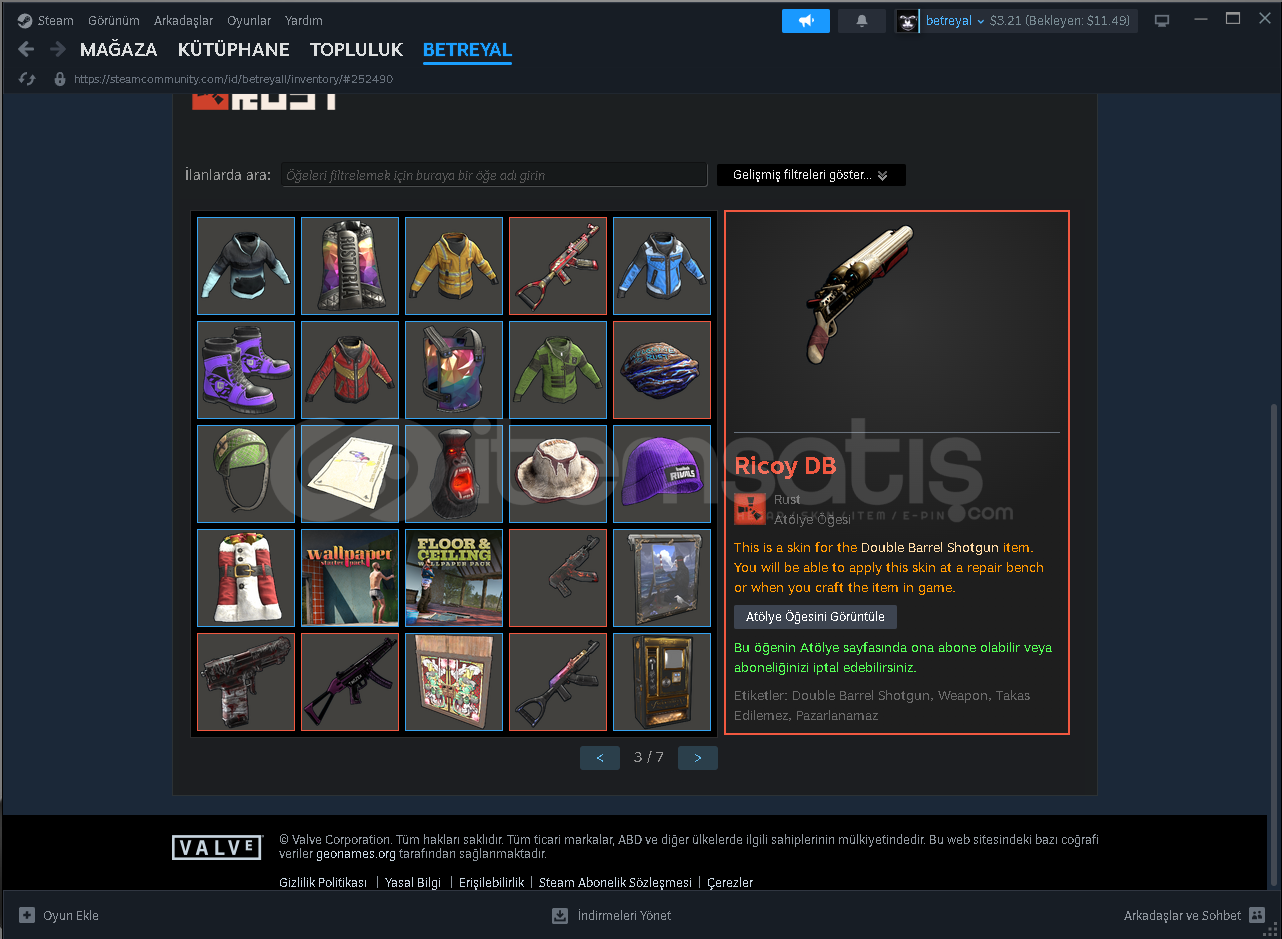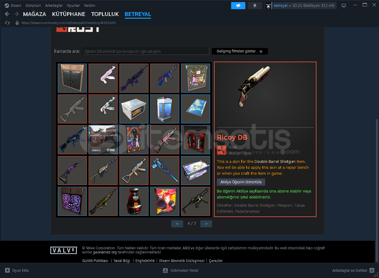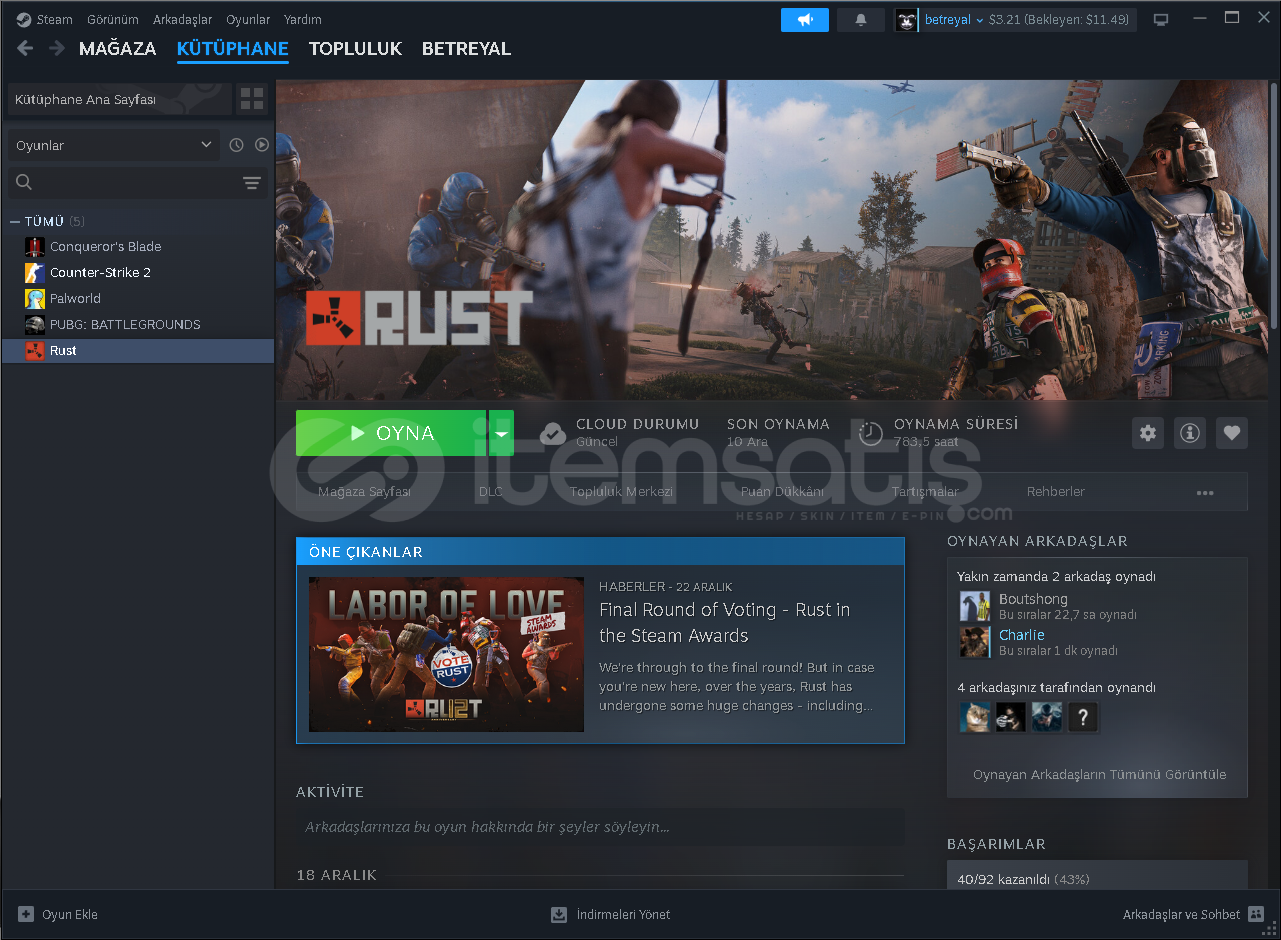 Rustta yaklaşık 100 dolarlık pack vardır oyun içi ev skinleri duvar skinleri mevcuttur . Csgo seçkin akfiftir face it hesabı hiç oluşturmadım ve 280 dolarlık item vardır . Ekstra olarak 15 dolar steam bakiyesi vardır . Hesabı ilk maili ile teslim edicem alıcısına hayırlı olsun