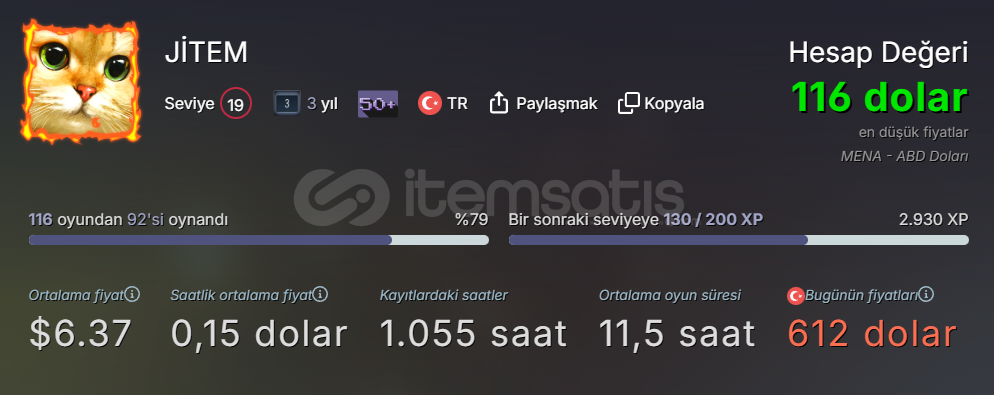 Hesap Değeri Steam İnfo da 116 dolar - 4896 TL yapıyor