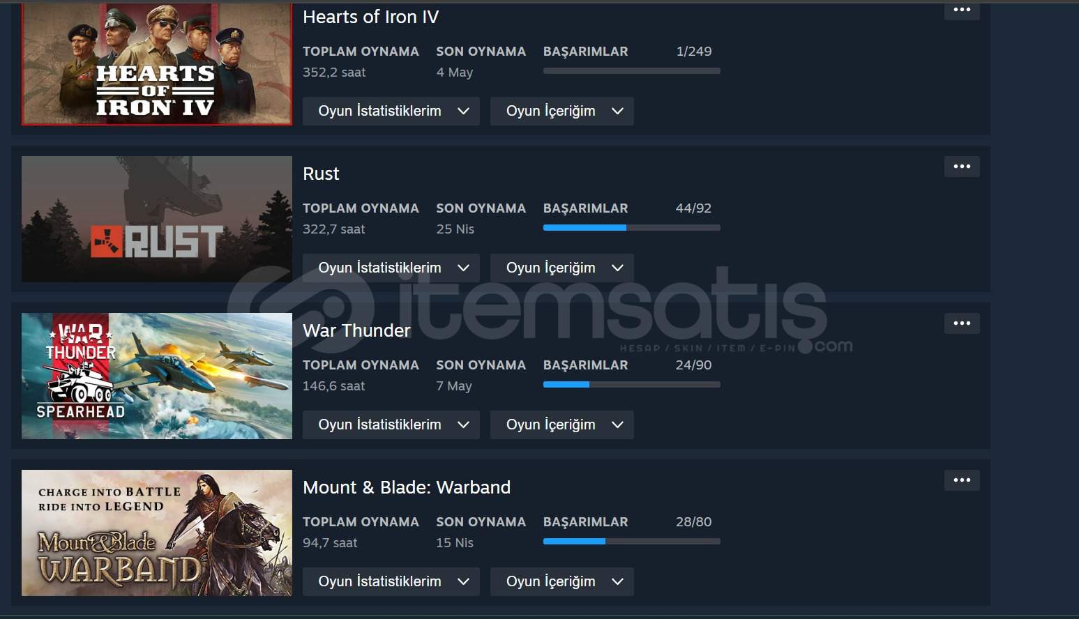 Hesap maili degistirilere teslim edilecektir icindeki oyunlarCS2 (seckin hesap aktif)RustHOI4 (Battle for Bosphorus DLCsi aktif)METRO 2033METRO 2033 Last Night ReduxMount And Blade Warband (Tum warband serisi dahil)The Witcher 2 Enchaned EditionLeft 4 Dead 2Kingdom Come DelivarenceARK Survival Fittest ve EvolvedRetrowaveRanch SimulatorETS 2Poppy Play Time (Hangi Chapterlar var bilgim yok)Gta 4 (diger ek 2 oyunu da dahil)The ForestAge Of History 2Rust Envanterinde 3 dolarlik kiyafet skinleri bulu...