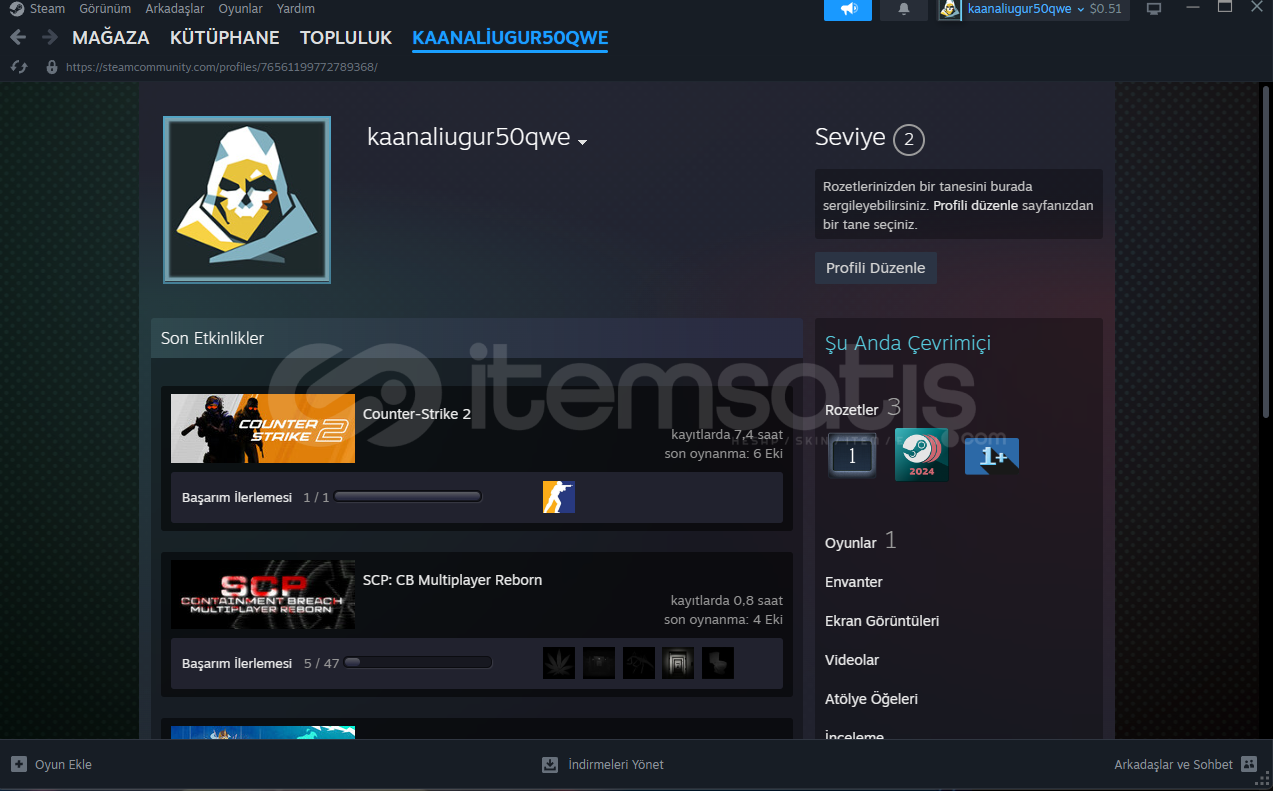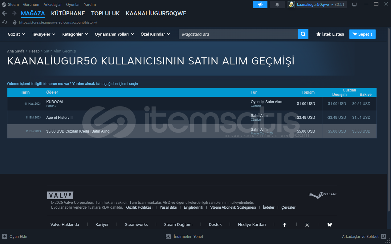 hesapta Age of History II oyunu vardırve bakiye olarak 50 cent vardır steam leveli 2 dir