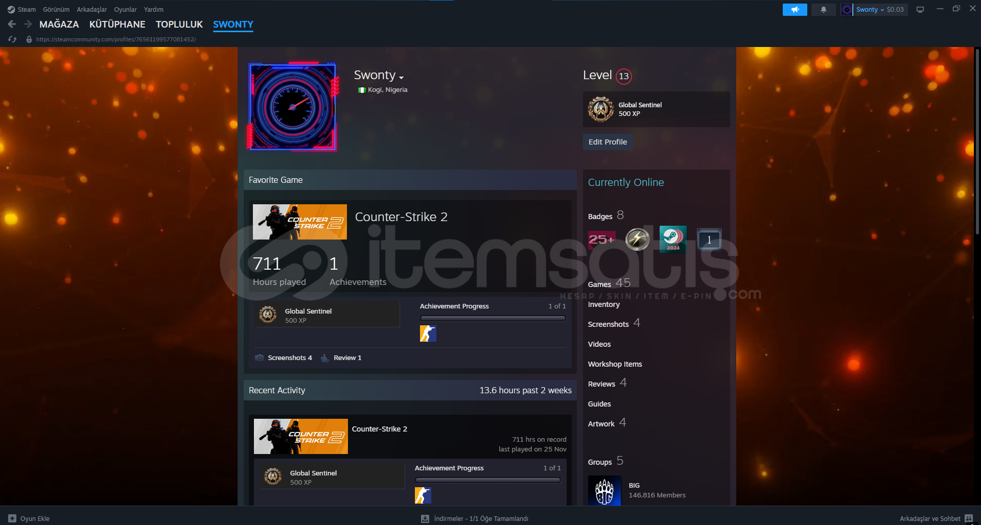 merak ettiğiniz birşey olurs yazabilirsiniz hesap linki : https://steamcommunity.com/profiles/76561199577081452/CS2 skinler mevcuttur (3$)imzali profiloyun saatleri fazladıriçinde değerli oyunlar vardır