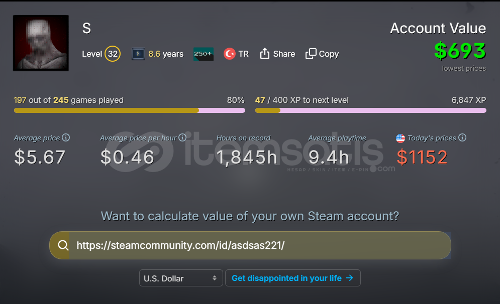 https://steamdb.info/calculator/76561198364698137/?cc=usortalama degeri 700-1150$HESABA BURADAN BAKABİLİRSİNİZGayet degerli bir hesaptir kendi sahsi hesabim.