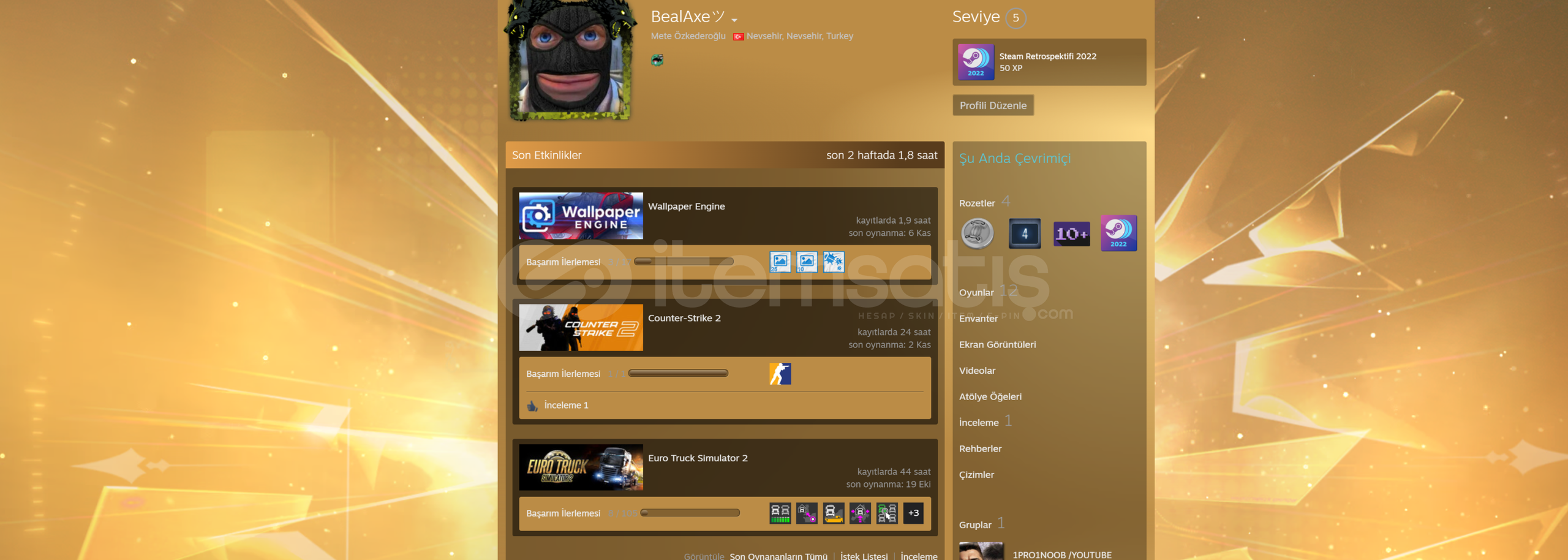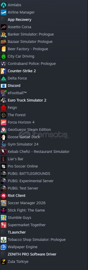 Steam hesabında demo ve ücretli oyunlar dahil 31 oyun bulunuyor.Hesap seviyesi 5,rozetler,başarılar bulunuyor.hesapdaki oyunlar:AimlabsAirlane sim.Asetto corsaBanker sim:Bazzar sim.Beer factoryCity car driv.Contraband Police sim.CS 2Delta ForeeFootballEuro Trucks Sim.FeingThe ForestForza Horizon 4Geo GuesserGoose Goose DuckGym si.Kebab ChefsLiar's barPro Soccer onlnePUBGSoccer manager 26Stick FitesStumbel GysSupermarket TogetherTobacco ShopWalpeper EngineZula