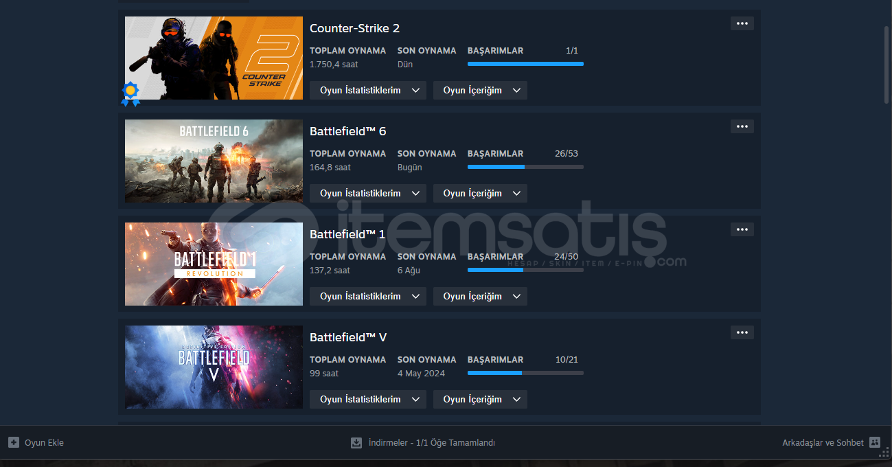 Battlefield 6 ve bf6 pro mevcuttur ek olarak bf1 bf5 bf2042 serileri vardır cs2 zaten var totalde 17 oyun var steamdb üzerinden bakıld&...