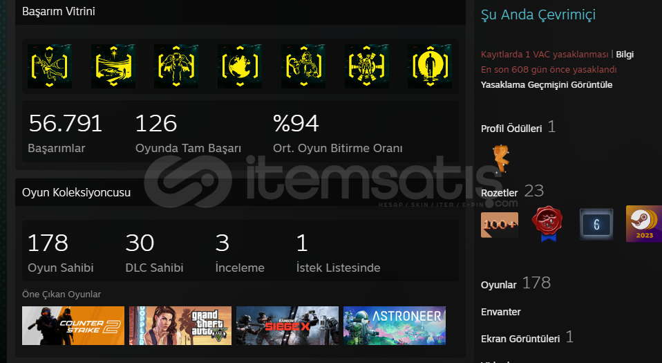 HESAP 6.7 YILLIK BÜTÜN BİLGİLERİ DEĞİŞİR VE HESAP KURULURKEN Kİ STEAM GUARD KODU İLE BİRLİKTE VERİLİCEKTİR (ÇALINMA VS. DURUMLARIN DA BU KODU KULLANARAK GERİ ALABİLİRSİNİZ.)CS2 VE GTA5 ONLİNE ''BANLIDIR'' GTA5 STORY MODA GİRİŞ SAĞLAR.178 OYUN 56.791 BAŞARIM MEVCUTTUR.HESAP 31 LEVELE KADAR YÜKSELTİLMİŞTİR.---------------------------...
