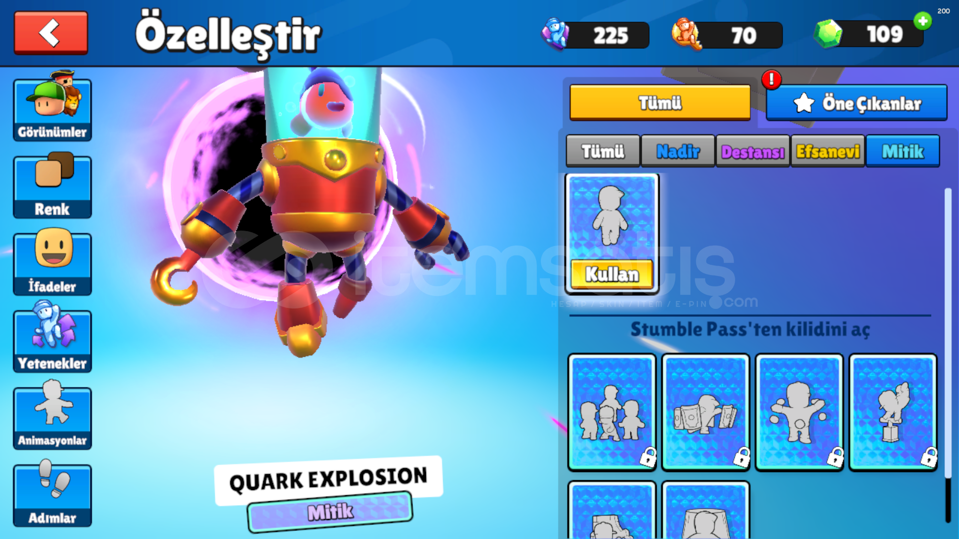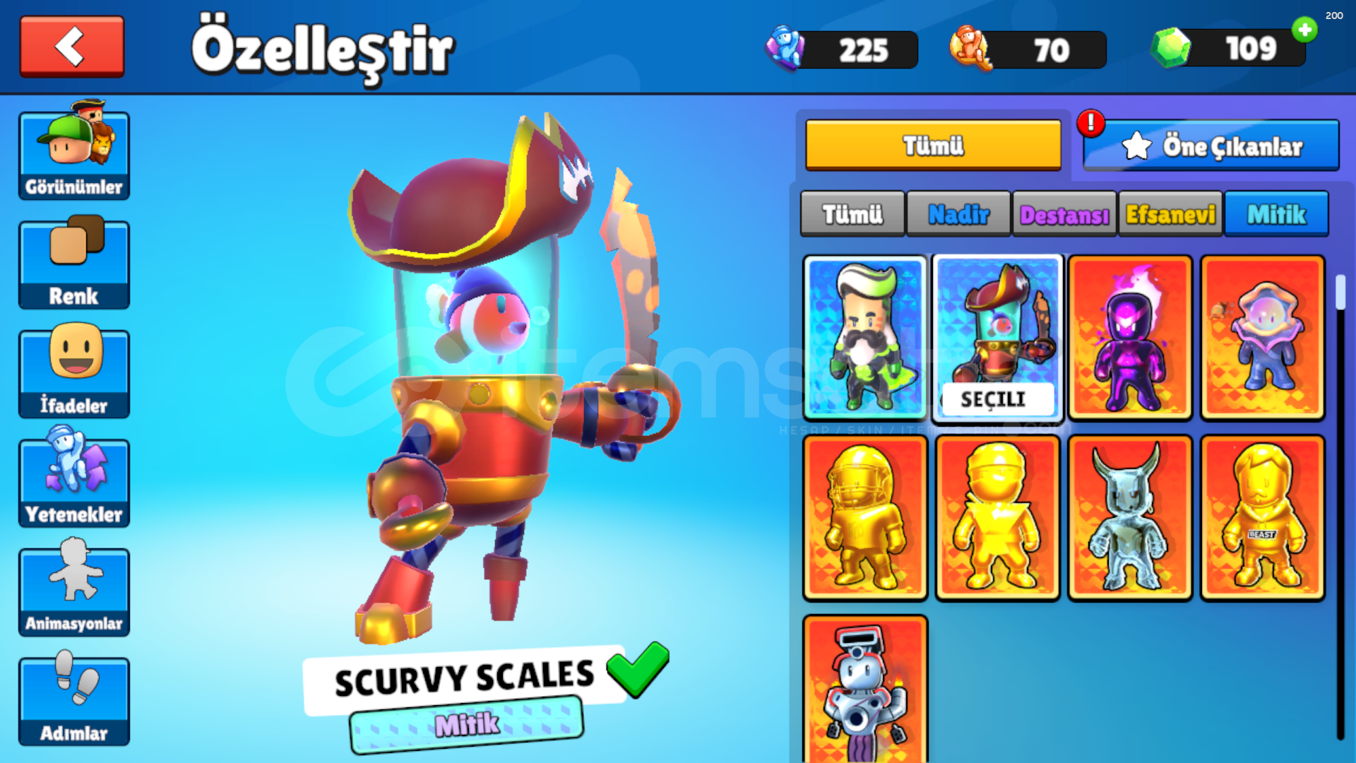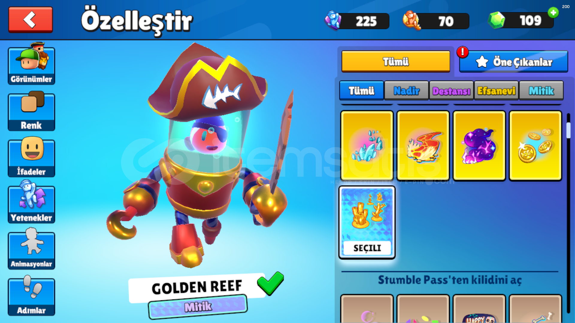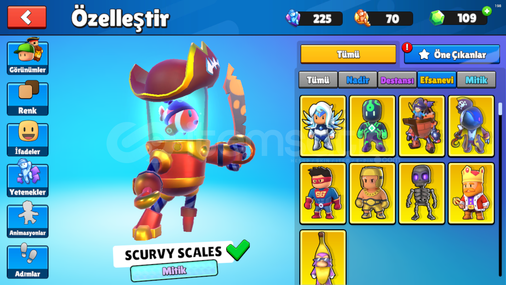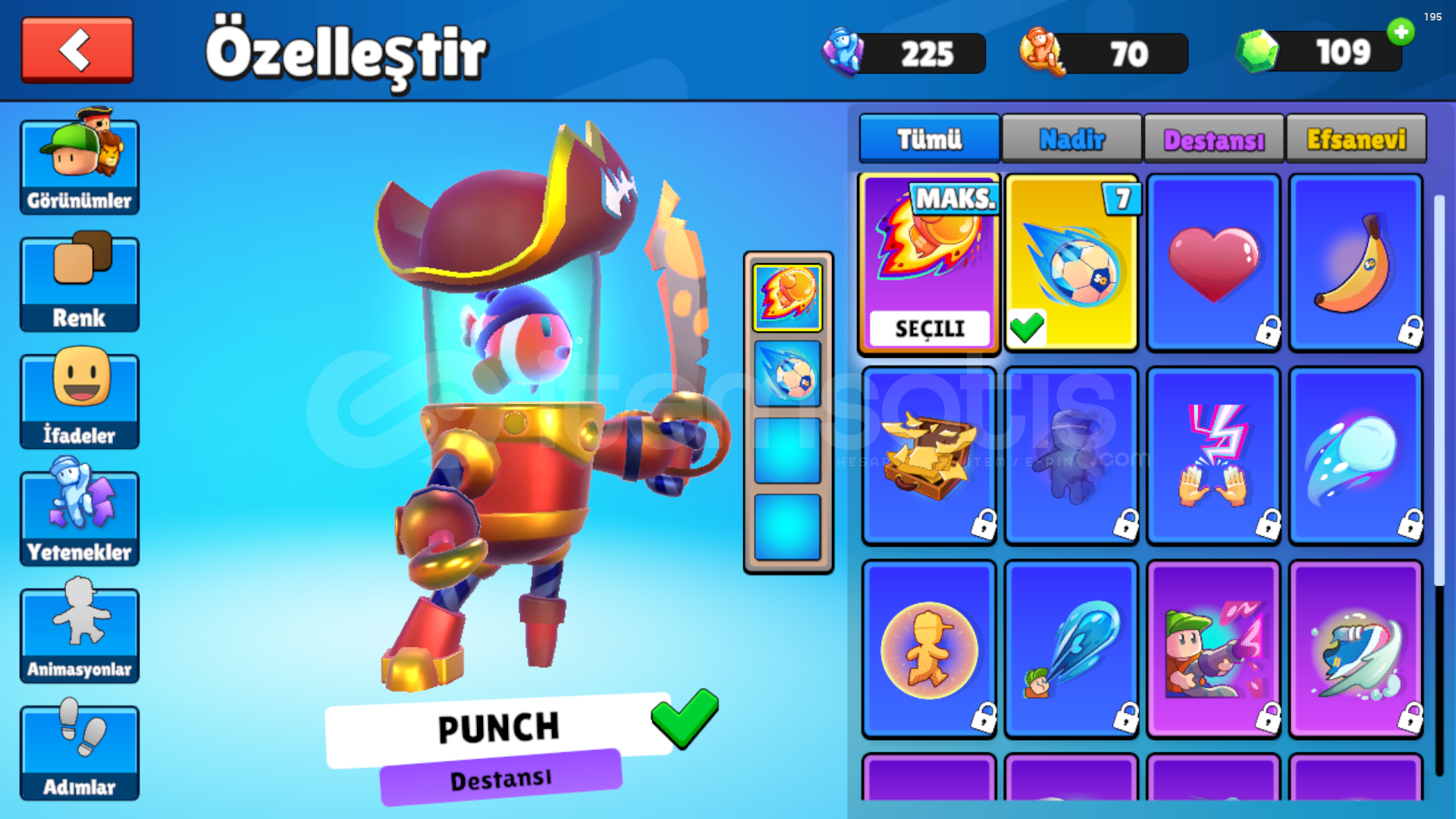 7 ÖZEL KOSTÜM2 MİTİK KOSTÜM9 EFSANEVİ KOSTÜM31 DESTANSI KOSTÜM36 NADİR KOSTÜMPUNCH VE BOUNCİNG BALL ÖZELLİĞİ VARDIR1 MİTİK ANİMASYON6 EFSANEVİ ANİMASYON4 DESTANSI ANİMASYON5 NADİR ANİMASYON109 ELMAS170 YETENEK ANAHTARI62 WİN5450 KUPAEN UCUZU