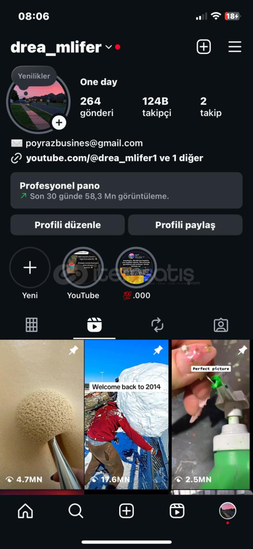 Sayfamın tamamı organik 124.000 takipçisi mevcut olup, reels yoğunluklu sayfam ayda yaklaşık 60-90 Milyon görüntülenme almaktadır.