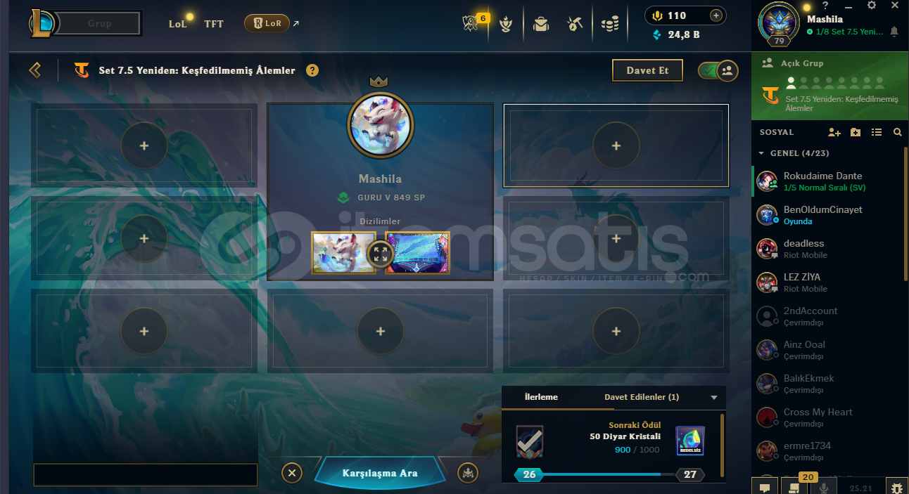 🌌 TFT (Teamfight Tactics) Hesap Satışı – Guru IV 579 SP⭐ Seviye 79💠 30. Seviye K.O. Kolezyumu Kartı aktif💎 24.800+ Mavi Öz + 195 TFT Parçacığı🐾 Strateji Ustaları (Chibiler)Can Tanesi Bungo ⭐⭐⭐⭐Birçok nadir ve özel küçük efsane (16+ adet, çoğu 3 yıldız)🏟️ Arena GörünümleriAşırı Y...