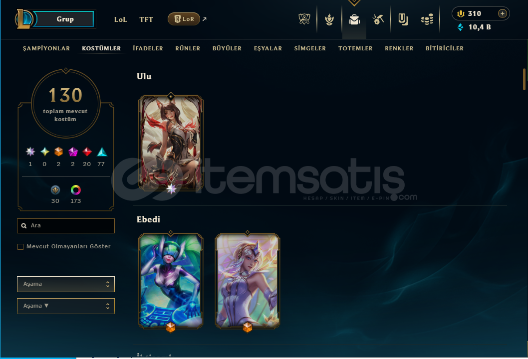 Genellikle çok aktif değilim, gece bakıyorum, mesaj atarsanız ilgilenirim. Paraya ihtiyacım olduğu için ucuza satıyorum.Tft lol hesap aynı hesaptır, hesap maille birlikte verilecektir.5 adet ihtişamlı chibi karakter (toplam 1k dolar değerinde),Toplam 173 tft karakteri,25 arena,25 çatapat5 geçitLol hesabı:1 Ulu kostüm2 ebedi kostüm2 ihtişamlı kostüm20 efsanevi kostüm77 destans...