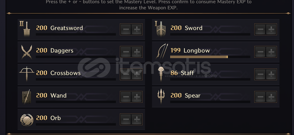 WEAPON MASTERY seviyelerimi Ek'te bırakıyorum. Sadece 1 itemin leveli düşük diğer tüm leveller 200!
