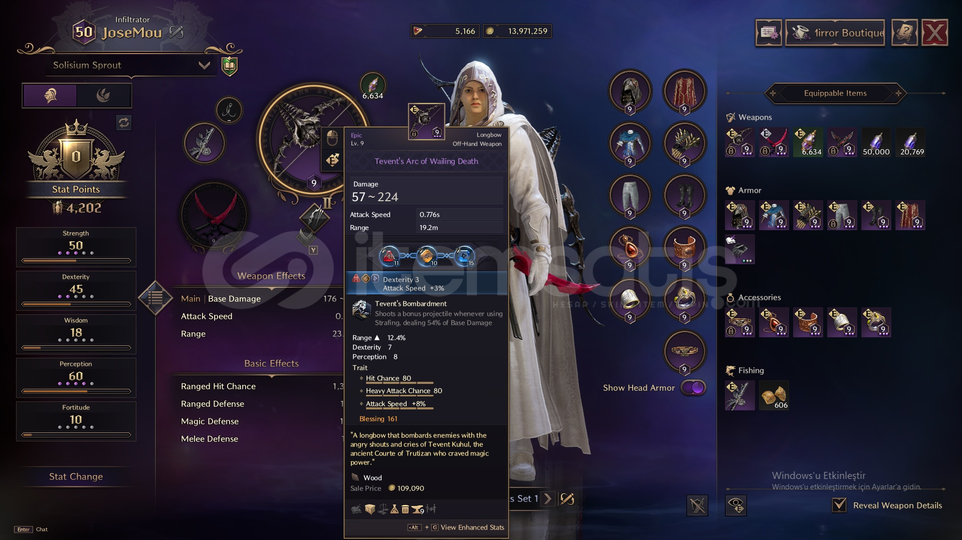 Karakterde Tevent Bow mecvuttur.Karakter GearScore : 4202 ( Güncel )İtemlar Full Traittir.Darkslayer Dagger ve Lequirus Dagger olmak üzere 2 ayrı Dagger bulunuyor.Ayrıca 5000 Lucent Bulunuyor.Server : ArkhanTANK KESEN RANGE :)