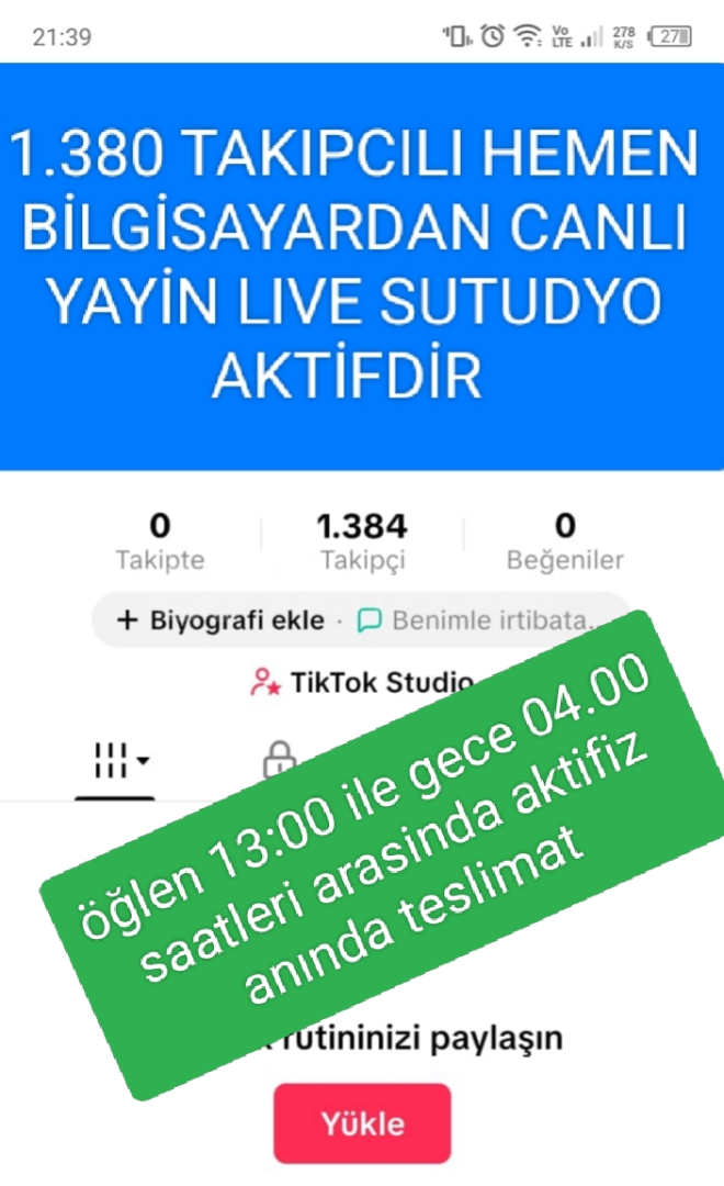 selamunaleykum arkadaşlar hesap tertemizdir kesinlikle uyari ihlal almamis kimlik dogrulamasi yapilmamis tiktok hesabim uygun fiyatiyla sizlerle yetisen alirbu hesabimizda live sutudyo aktifdir bilgisayardan canli yayin yapilabilir ...HESAPLARIN HEPSİ TÜRKİYE KONUMLUDUR her gun öğle 12.00 ile gece 04.00 saatleri arasinda aktifiz. Siz site üzerinden mesaj gönderdiğinizde bana bildirim gelmiyor ama satın alırsanız SMS geliyor&nb...