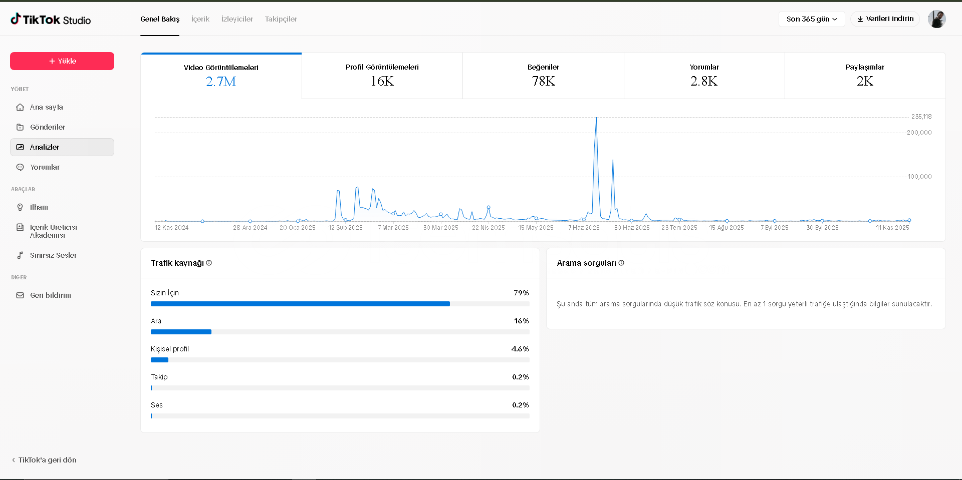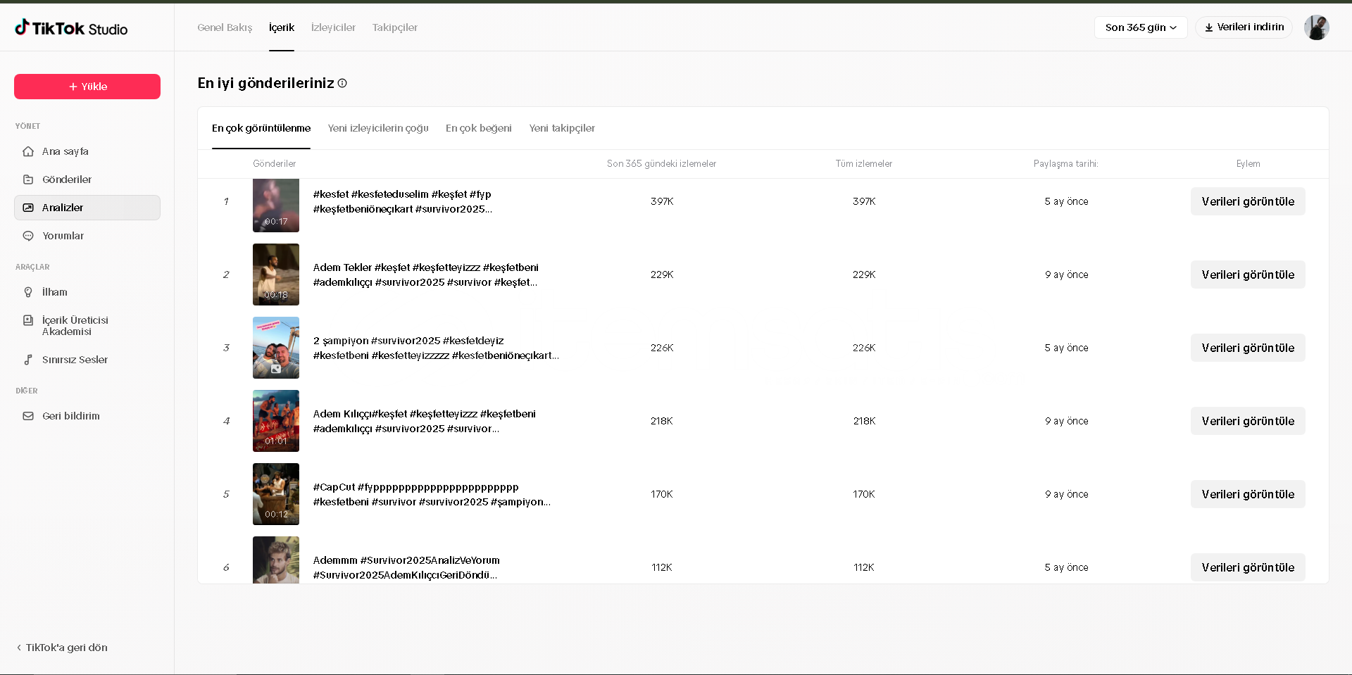 • Videolar düzenli olarak “Sizin İçin” sayfasına düşüyor, son 7 günlük etkileşimler hâlâ yüksektir.