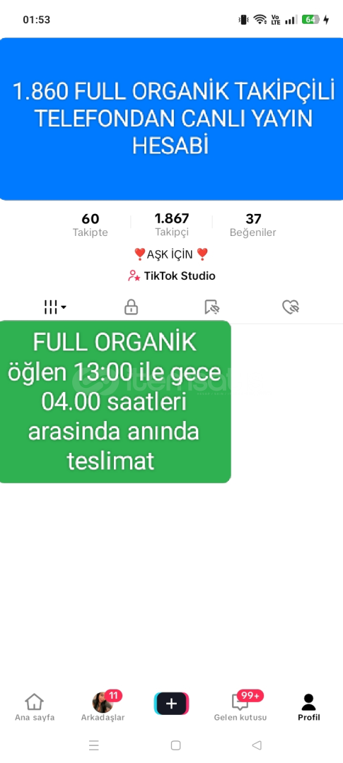 selamunaleykum arkadaşlar hesap tertemizdir kesinlikle uyari ihlal almamis kimlik dogrulamasi yapilmamis tiktok hesabim uygun fiyatiyla sizlerle yetisen alirbu hesabimizda live sutudyo aktif değildir sadece telefondan canli yayin ve mobil oyun aktiftir ...HESAPLARIN HEPSİ TÜRKİYE KONUMLUDUR her gun öğle 12.00 ile gece 04.00 saatleri arasinda aktifiz. Siz site üzerinden mesaj gönderdiğinizde bana bildirim gelmiyor ama satın alırsan&...