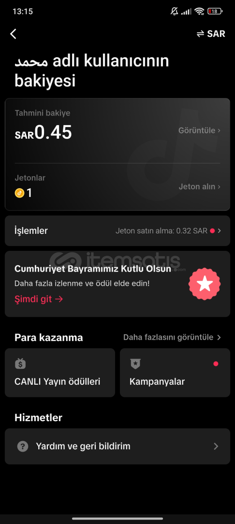 💰 Bakiye: 0.45 SAR + 1 Jeton