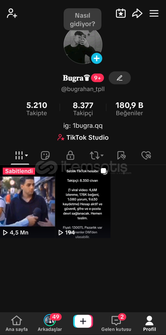 Satılık TikTok hesabı: Takipçiler bot değildir 5 yıllık emek verdiğim hesap takipçilerin hepsi gerçek.Takipçi: 8.370 civarı(1 viral video: 4,6M izlenme, 178K beğeni, 1.080 yorum, 9.630 kaydetme) Hesap aktif ve güvenli, şifre ve e-posta devri sağlanacak. Hemen teslim.Fiyat:900 TL Pazarlık varİlgilenenler DM’den ulaşabilir.