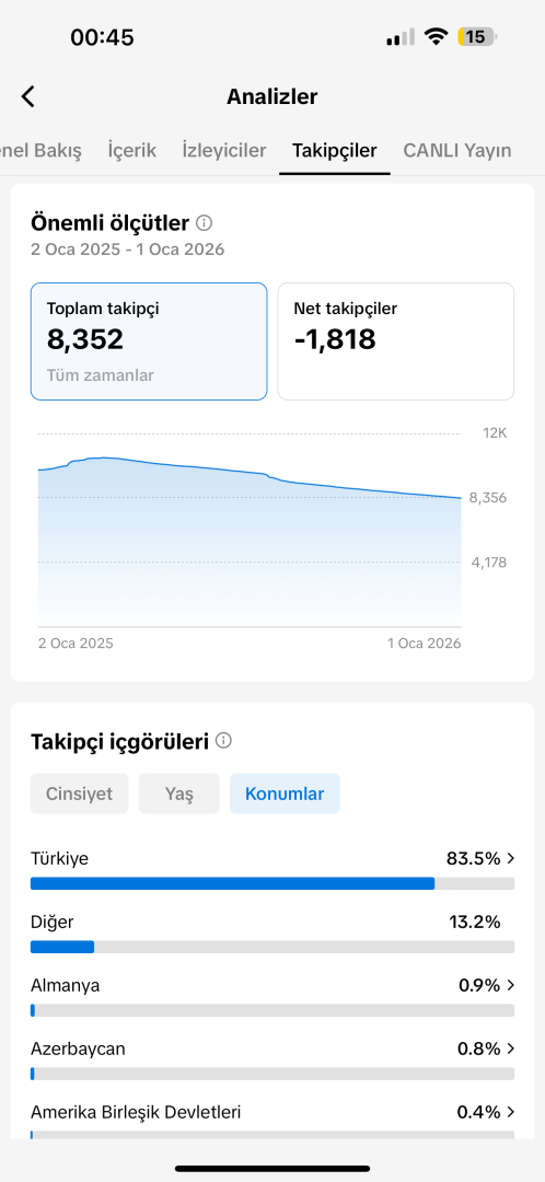 8300 takipçisi vardır bot yok tüm takipçiler türkiye konumundan keşfeti açık ve video izleyici konumlarıda türkiye