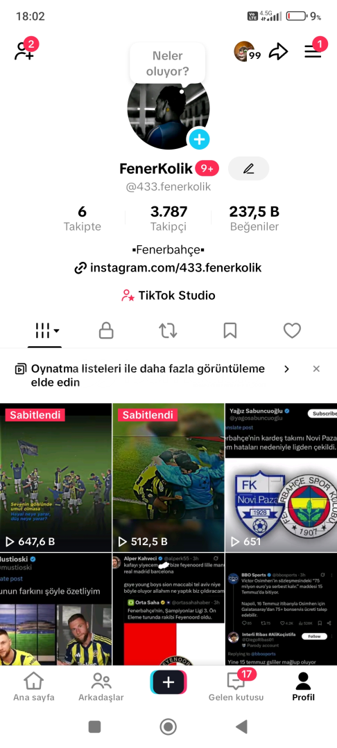 *Merhaba ilanıma hoşgeldiniz 3.787 takipçili 237,5B organik beğenili. Hesab bölgesi Türkiye Hesab linki tiktok.com/@433.fenerkolik bakabilirsiniz.🎥Canlı yayın açık live studio aktif keşfetli hesab fotbol içerikli temiz hesab ihlal yok.📅2022 kurulumlu bot takipçi yoktur organik ilanı satın alırsanız SMS gelir aktif olup teslim yaparım. NOT: CİDDİ ALICILARA PAZARLIK YAPILIR.&...