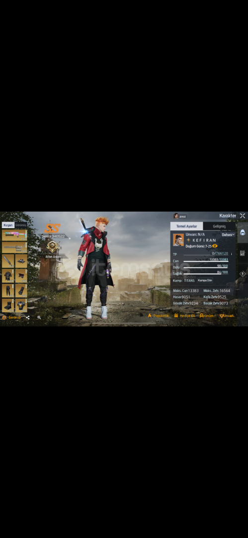 350k hesap eksik yönleri ile uğraşırım diyen olursa 360k yı geçecek potansiyeldedir. Yüksek azim 4zırh patlatma 4can teknolojisi 4savaşta iyileş. 4zırh yenileme 4acil durum 3 seviyeAyrıca hesapta adetsel çeşitli olarak 40 adet sarı çip vardır. Kozmetik kıyafet bakımından zengindir. Hesap ismi KEFIRAN-TİTANS kampında.